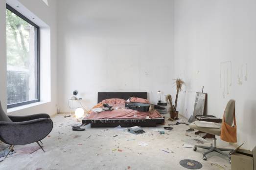 La storia (forse) di una donna che, reduce da un viaggio (da una valigia trabocca un capo di biancheria intima), è giunta nella dimora del suo amante, a sua volta amante della buona musica italiana (tanti i vinili da Dalla a Modugno a Milva) così come della scrittura (si vedano le lettere, la Olivetti 32, i versi poetici e manoscritti sulle pareti) e delle caramelle. Sono le cartine di queste a creare un trasandato ricamo sulla moquette un tempo bianca e ormai “negativo” di tracce, di orme, di vino, di cenere. E qui torna la consumazione, richiamata dai resti di qualcosa che è bruciato: la sigaretta, come la passione che si suppone consumata sul talamo fulcro dell’opera, in cui si concentrano gli indizi per l’apparente soluzione di questo rebus/giallo.