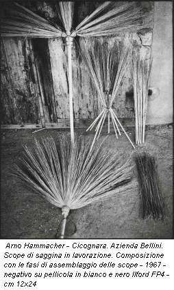 quando l’olandese sperimentava strumenti e tecnologie. Hammacher sceglieva allora di modificare l’utilizzo classico e, di conseguenza, i risultati del mezzo fotografico, realizzando un prodotto non più statico. Si tratta di sequenze realizzate nel Parco del Ticino, proposte in perfetta sincronia con il sonoro. Protagonisti sono gli ingranaggi delle macchine agricole, segno dell’avanzare della presenza dell’uomo nella natura. Le distinzioni tematiche operate in mostra non elidono la continuità del lavoro di Hammacher. Nell’estrema eterogeneità dei soggetti si rintraccia l’interesse per l’ambiente e la materia, naturali o artificiali, o semplicemente antropizzati, luogo e prodotto della vita e dell’attività umana, dai manufatti artigianali alle componenti industriali. Quale che sia l’oggetto, risaltano i valori formali, le linee strutturali, la semplicità della loro essenza. Non è quindi casuale la condivisione del percorso dell’olandese con vari artisti, soprattutto scultori, documentato da alcuni scatti. Il gesto di Hammacher è, infatti, prima di tutto concettuale, determinato dalla scelta e dalla presenza dell’autore, di cui è spesso visibile l’ombra.