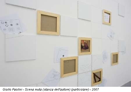 L’allestimento di Zeusi e Parrasio fornisce anche una soglia, introduzione all’operazione murale e a un nuovo spazio concettuale. Scena muta (la stanza dell’autore) si compone di citazionismo interno e citazionismo esterno. Un assemblaggio ragionato e misurato di strumenti da lavoro, tavole sul disegno geometrico e tele bianche, frontali o rovesciate, che rappresentano la tela. Per comunicare la sospensione che produce la cornice: “Tutto insomma lì si trova, a misura di un domani uguale a ieri”.