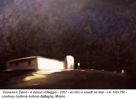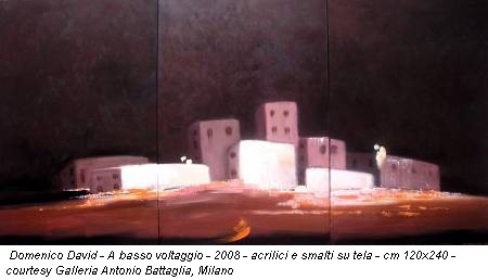 Dopo che già nel 2007 la galleria Antonio Battaglia aveva ospitato le opere di David in una collettiva, l’esibizione corrente ne suggella il ritorno in toni aulici e sognanti. A basso voltaggio, il titolo della mostra, richiama l’idea di luce artificiale nelle moderne metropoli, l’energia elettrica che corre lungo i fili di rame, permettendo al profilo urbano di vivere ed essere visibile anche nel buio della notte. Nel momento in cui l’argomento energetico diventa ormai pane quotidiano nei dibattiti di tutto il pianeta, il basso voltaggio, di cui s’illuminano i lavori di David, assurge a inno alla moderazione dei consumi, a esaltazione del valore indispensabile della luce elettrica per la visione di ciò che l’oscurità divora.