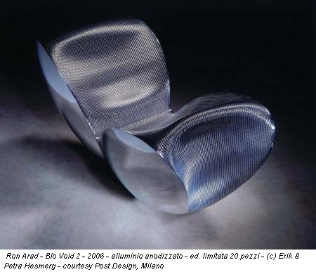 Ron Arad (Tel Aviv, 1951; vive a Londra) ama la sperimentazione sui materiali ed è affascinato dai metalli. Li piega, li manipola, dà loro una forma. Più forme. Caratterizzate da un affascinante trompe l’oeil, piacere per la vista e per il tatto. Non sarà una tentazione uniformemente diffusa ma, guardando la selezione di sedute Blu Void e Oh Void in esposizione presso la galleria Post Design di Milano, si ha voglia di toccarle. Le si accarezza, sfiorando la superficie in acciaio patinato dei due pezzi in edizione limitata e numerata datati 1988 della collezione One Off. E facendo scivolare la mano sulla superficie in alluminio anodizzato degli esemplari Blu Void (2006) argentei, verdi, neri, improntati all’energia plastica di forme concave e forme convesse, pieni e vuoti, materia colorata e… nulla.