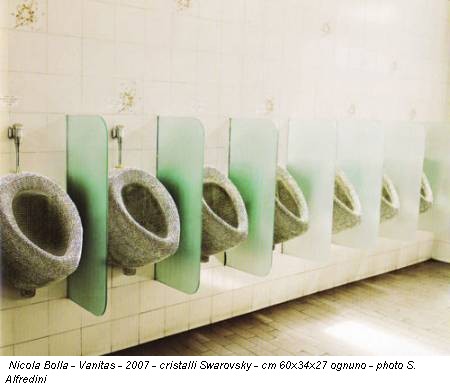 Dopo lo straordinario successo mediatico di For the love of god (2007) di Damien Hirst, Nicola Bolla ripresenta un suo lavoro fondato sul simbolo della vanitas per eccellenza. I suoi teschi, costruiti con tanti piccoli cristalli Swarovsky, ricordano infatti fortemente quello tempestato di diamanti di Hirst. Ma questa volta l’appropriazione non è di Bolla, che di teschi eseguiti con questa modalità ne produce già dal 1997. Che dire, allora? Forse un sentire comune, una manifestazione dello zeitgeist?