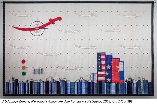 Il 1989, è associato alla caduta del Muro di Berlino, alla protesta di piazza Tienanmen a Pechino, al bicentenario della Rivoluzione francese e nell’ambito artistico alla mostra “Les Magicienes de la Terre”, a cura di Jean-Hubert Martin al Centre Pompidou e Grande Halle de la Vilette a Parigi. La prima esposizione all’insegna del multiculturalismo, incentrata sulle trasformazioni del rapporto tra il “centro” (Stati Uniti ed Europa occidentale) e le cosiddette “periferie” (Africa, America Latina, Asia e Australia), un’attitudine extraeuropea che divenne specchio di una visione globale dagli anni ’90 a oggi. Abdoulaye Konatè (1953, Mali) è il frutto di questa generazione di artisti post-coloniali, che recuperano valori autoctoni, pratiche rituali, identità culturali, contro gli effetti omologanti della globalizzazione, come il tessuto di cotone utilizzato al posto della pittura. Konatè, dopo la formazione artistica in pittura presso l’istituto Nazionale delle Arti di Bamko, dove vive e lavora, abbandona la tavolozza e adotta il textile di cotone come icona, indice e simbolo della sua Africa.
