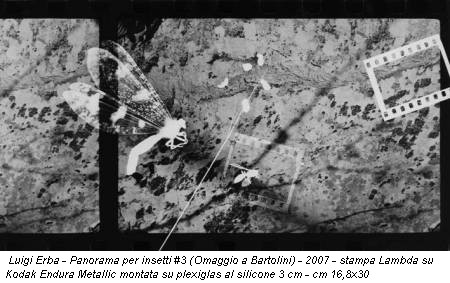 Nei quattro cicli esposti emergono molteplici elementi del linguaggio fotografico. Scatto e contatto diretto (di fiori, insetti), sovrapposizione su texture differenti, l’utilizzo di carta metallizzata contenuta in un volume di plexiglas, rendono Panorami per insetti scenari onirici. Non a caso, a catalogo Roberto Mutti fa riferimento a una poetica di stampo surrealista.