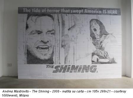 L’ingresso di 1000eventi accoglie con una grande parete in carta dalla composizione modulare: 171.360 fogli impilati in nove colonne, su cui è tracciato a matita il trailer di Shining di Stanley Kubrick. Nell’equivalenza matematica che decide la grandezza della base dell’intervento grafico, Mastrovito pensa al foglio come a un fotogramma, che costruisce, nella sua relazione totale, il senso della pellicola.