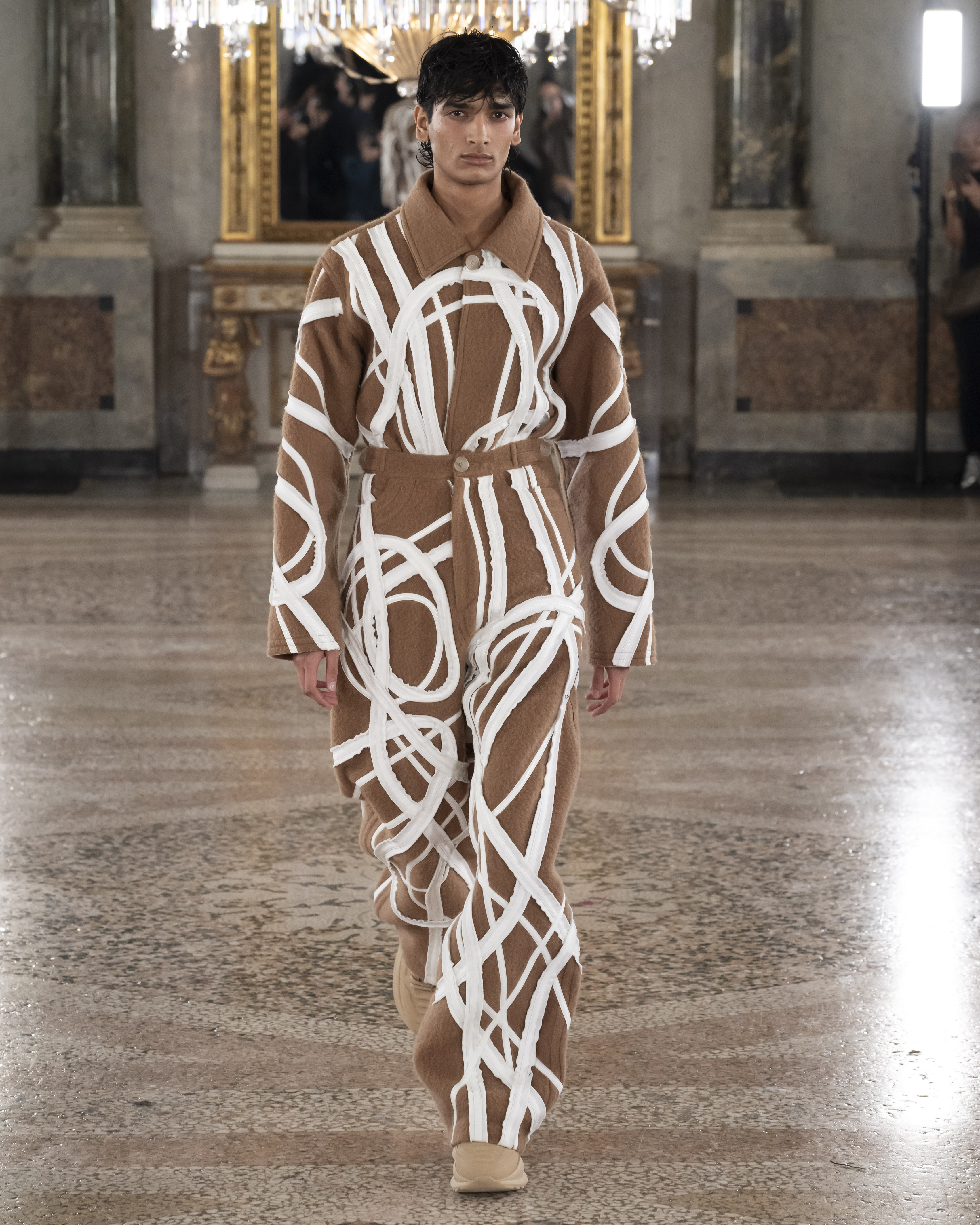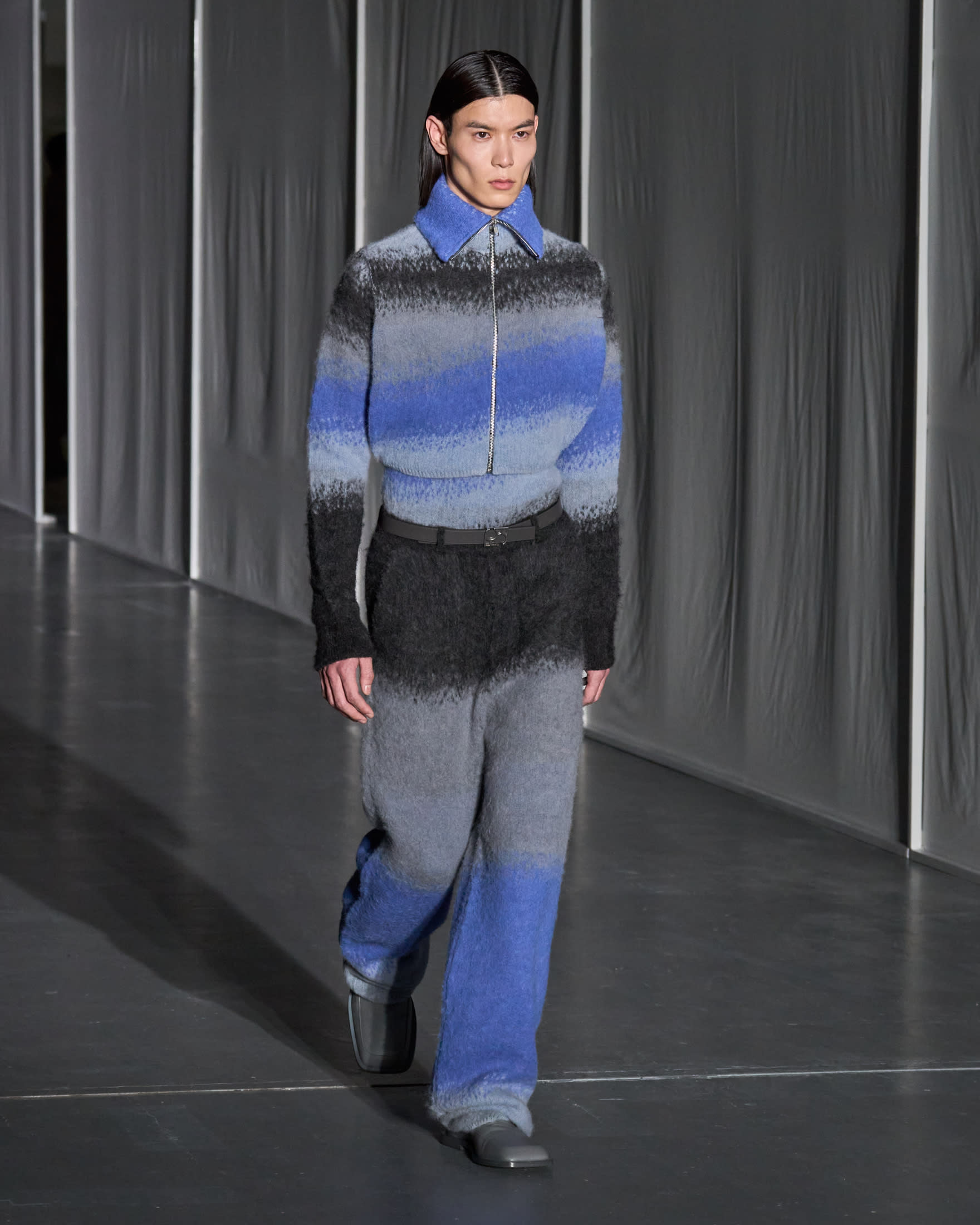 Il designer campano si è rivolto all’azienda italiana Gruppo Cinque per i tessuti dei suoi capi, che tra gli altri comprendono materiali tecnici traspiranti e al contempo garanti di riparazione dal freddo. In generale la collezione è stata concepita per essere combinata a quella precedente presentata a Pitti, A0 24 Moderate. Un approccio pragmatico e sostenibile, per un brand che ha l’obiettivo di annullare le distanze tra ambiente naturale e urbano, tra sartorialità e sportswear, tra Made in Italy e innovazione.