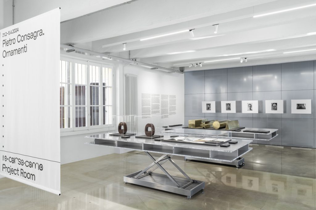 La Project Room si presenta invece come un’ampia navata dove al posto delle panche trova spazio Il piano alchemico, un’accurata selezione di libri rari, riviste e oggetti di design appositamente selezionati da Domitilla Dardi. Al posto dell’altare, introdotta da due stendardi, si trova la piccola ma preziosa mostra dedicata ai gioielli di Pietro Consagra. Curata da Alessio de’Navasques, l’esposizione Pietro Consagra. Ornamenti raccoglie per la prima volta l’intera serie di maschere e ornamenti per il corpo realizzati nella fucina creativa di GianCarlo Montebello. Oltrepassando il puro senso estetico, ma senza dimenticarlo, le opere vengono forgiate dal filosofico incontro tra il pensiero dell’artista sul concetto di frontalità e gli stereotipi incollati alla figura femminile, sorto anche dallo scambio reciproco di sensibilità tra Consagra e l’allora compagna Carla Lonzi, per un cambiamento di prospettiva volto a rimuovere «i punti morti di una cultura che viaggia solo sulla coscienza maschile». Concettuali, ironici e provocatori, i gioielli dai loro supporti sui tavoli tornano a prendere vita nelle fotografie di Ugo Mulas, che unitamente al materiale documentario proveniente dall’Archivio Pietro Consagra, contribuiscono a restituire l’atmosfera di un peculiare episodio all’interno della produzione artistica del maestro dell’astrattismo italiano.