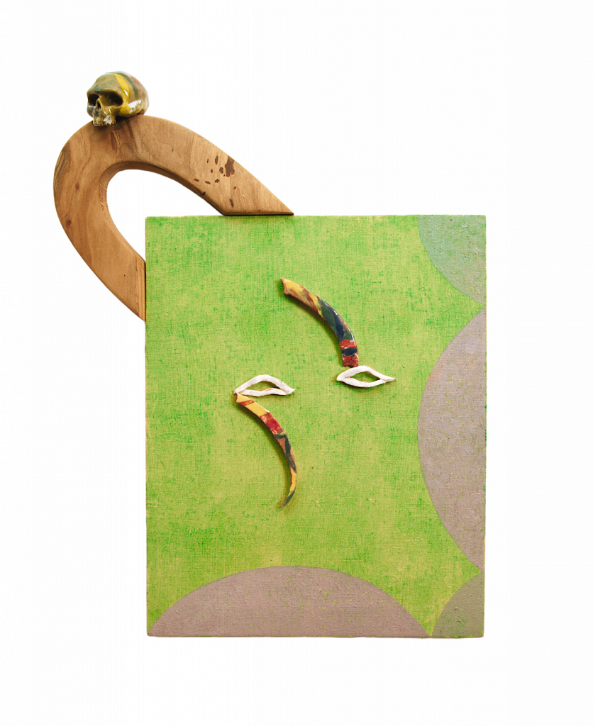 In alcune delle opere in mostra, Sinigaglia mescola la pittura, che costituisce sempre il punto di partenza del suo processo creativo, con il legno e la ceramica —componenti che lavora artigianalmente e che rispetta nelle proprie caratteristiche naturali e “storiche”. Nel caso dell’opera Love is a garden, la cornice scultorea in legno di castagno viene modellata dall’artista adeguandosi alla linearità o alla curvatura delle venature che compongono il materiale. L’inserimento della ceramica, che emerge in funzione dell’immagine pittorica, viene percepito dall’artista come necessario per poter definire l’opera in maniera organica e completa.