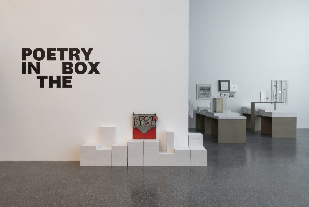 A legare le diverse voci è la ricerca per l’aspetto visivo della parola e del linguaggio, analizzato da Carrega nel concetto di scrittura simbiotica e che lo porterà a coniare il termine di Nuova Scrittura. Gallerista, poeta, traduttore ed editore Carrega è stato una figura poliedrica: mescolare le carte, sconfinare tra generi era parte essenziale del suo approccio. Sono quindi lavori sottili, indisciplinati e sfuggenti, da guardare e da leggere, quelli di Poetry in the box. Spesso il confine tra edizioni, opere e riviste è sfumato, come ad es. nella Scatola. Rivista oggetto di Carrega e Finotti. La parola è sempre protagonista, come fonte di infinite combinazioni di significato nei Permutatori manuali o diventa scultura mobile nel poemobile Love never keeps still. O, piegata, si fa oggetto nelle Verbosculture. In altri lavori non è solo la parola a farsi presenza fisica, ma anche il fisico a tradursi in parola, come nel sospiro del poeta (lungo e profondo) di Vincenzo Accame, che rievoca Bodies, mostra che raccoglieva frammenti corporali inviati da artisti di tutto il mondo. Tra le “chicche” anche le opere di Cards from the world (1973), una delle prime mostre di Mail art in Italia organizzate da Carrega. E poi l’edizione The Large Glass and Related Works, Vol. 2 1967-68, di Marcel Duchamp, artista a cui Carrega era particolarmente legato. Lo spirito duchampiano aleggia, del resto, su tutta la mostra, non solo per il concetto di scatola, in cui riecheggia la celebre Boîte-en-valise, ma anche per l’attenzione alla parola, alla sua forza e ai suoi enigmi che pervade le opere. E comincia dal nome scelto per lo spazio, Mercato del Sale, che altro non è che la traduzione dello pseudonimo dell’artista francese, Marchand du Sel. Fino all’ 1 settembre 2024.