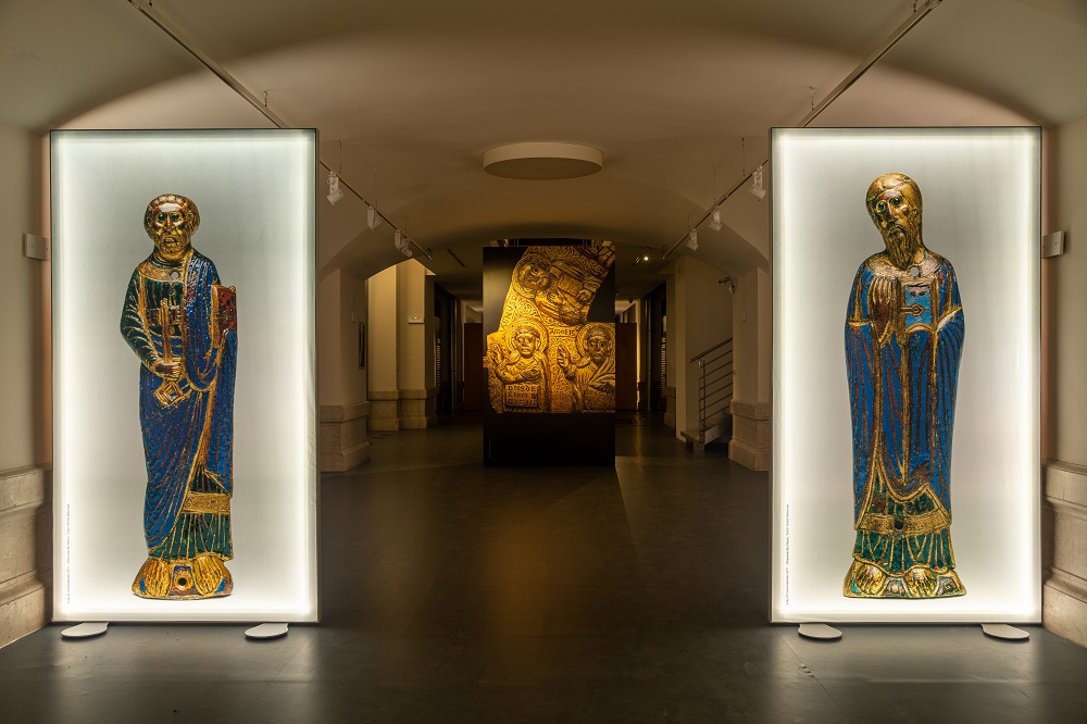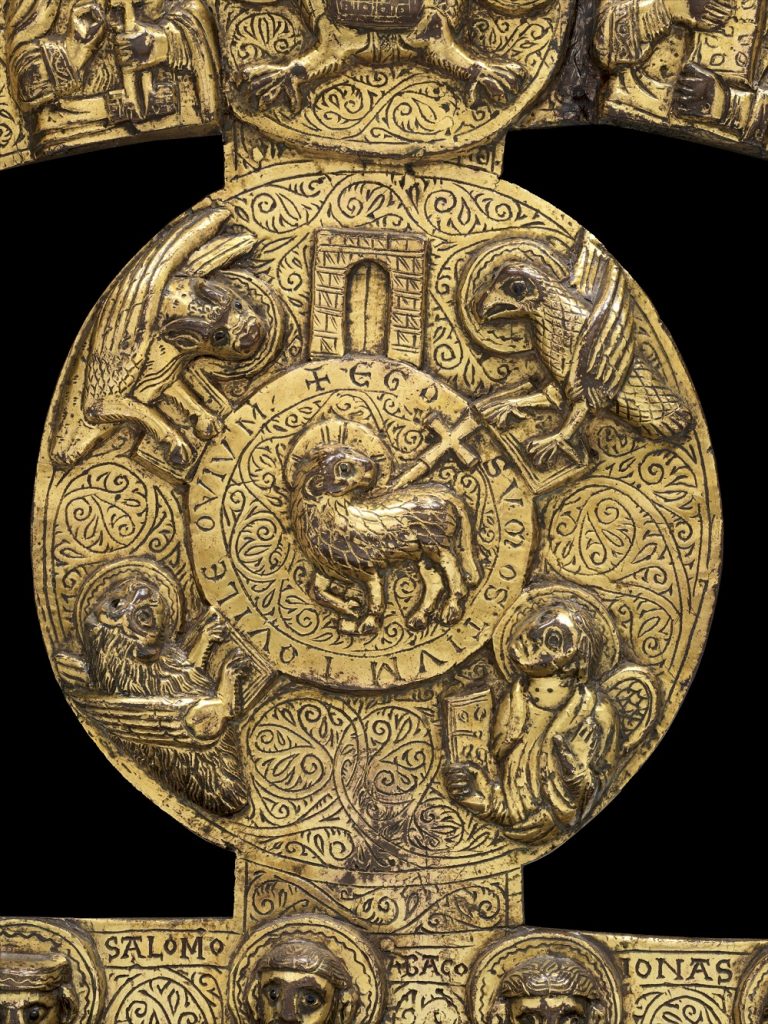 Perduta ogni traccia del primitivo edificio costantiniano, anche le testimonianze relative agli altri interventi di età medievale non sono più visibili, sia nell’impianto strutturale che relativamente ai cicli decorativi. All’interno di questa realtà medievale di San Pietro, rientrano gli interventi effettuati negli anni del pontificato di Innocenzo III. La mostra del VIVE permette di far riprendere corpo a questa importante fase della storia dell’edificio vaticano che tutti conoscono per lo più per i significativi interventi michelangioleschi e i progetti berniniani avvenuti nell’edificio dalla fase tardo-rinascimentale in avanti. La lunetta della Nicchia dei Palli, sulla quale è incentrata la mostra, è un’opera in bronzo dorato, con incisioni e inserti a smalto, lavorata su entrambi i lati. Sul recto della lamina sono presenti, a rilievo, le immagini di dodici profeti e dei dodici apostoli e, al centro, è rappresentato Cristo come Agnus Dei attorniato dai simboli del quattro Evangelisti. Sul verso, con un’esecuzione a incisione, sono raffigurate figure di vescovi inserite entro arcate su colonne e l’immagine di un pontefice e dello Spirito Santo sotto forma di colomba.