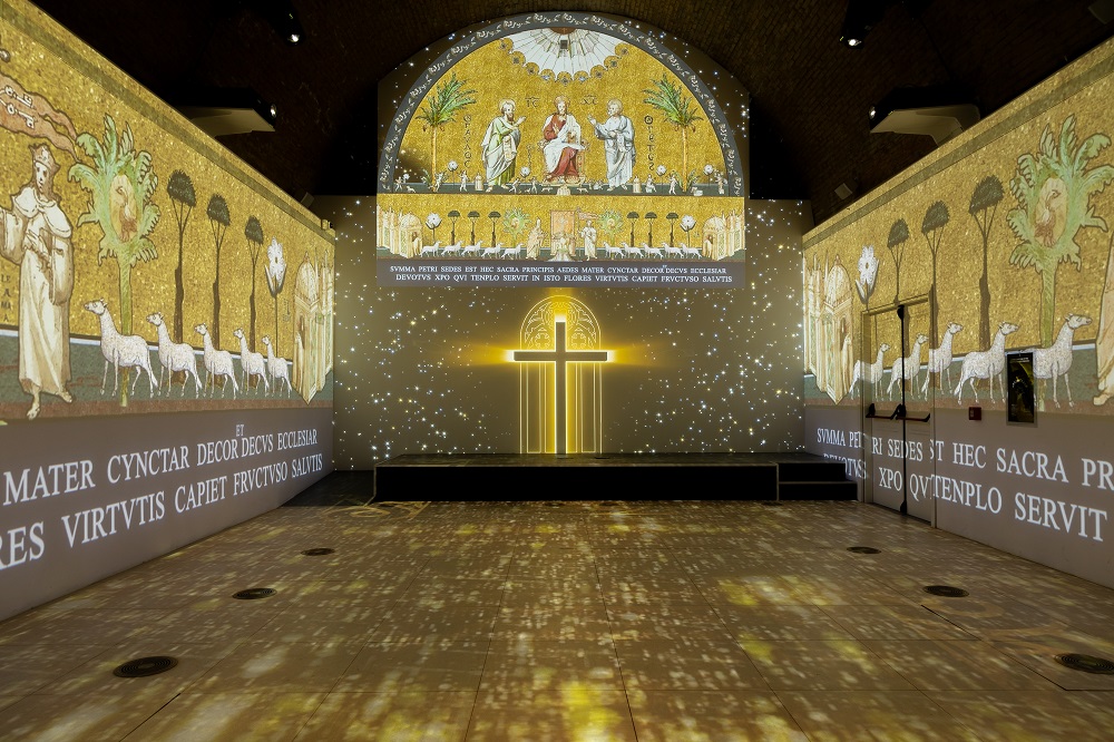 Il percorso espositivo prevede un articolato apparato iconografico corredato da pannelli che propongono approfondimenti sia sul piano storico che storico-artistico. Si tratta di una parte complementare rispetto all’esperienza della sala immersiva che, grazie al supporto di avanzate tecnologie di modellazione digitale 3D e realtà virtuale, restituisce, attraverso la proiezione sulle pareti e sul pavimento, l’aspetto dell’antica basilica di San Pietro dei tempi di Innocenzo III e dettagli ravvicinati della preziosa lunetta della Nicchia dei Palli di cui si può così apprezzare a pieno la raffinata fattura e il ricco apparato iconografico.