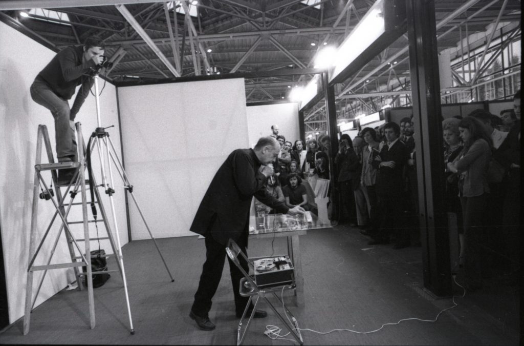 È dunque un rapporto, quello tra la performance e Arte Fiera, che esiste fin dalle origini. E la città di Bologna fu terreno fertile: già nel 1970 infatti, presso il Museo Civico Archeologico, in occasione della III Biennale Internazionale d’arte, intitolata Gennaio 70, comportamenti, progetti, mediazioni a cura di Renato Barilli, con contributi critici di Maurizio Calvesi e Tommaso Trini, furono presentate azioni e video performance. E, ancora, nel 1975 – il 31 maggio – nell’allora nuova Galleria d’arte moderna Fabio Mauri proiettò il film Il Vangelo secondo Matteo (Pier Paolo Pasolini, 1964), senza sonoro, sul corpo-schermo di Pasolini stesso con camicia bianca seduto su una sedia al centro della sala (Intellettuale).