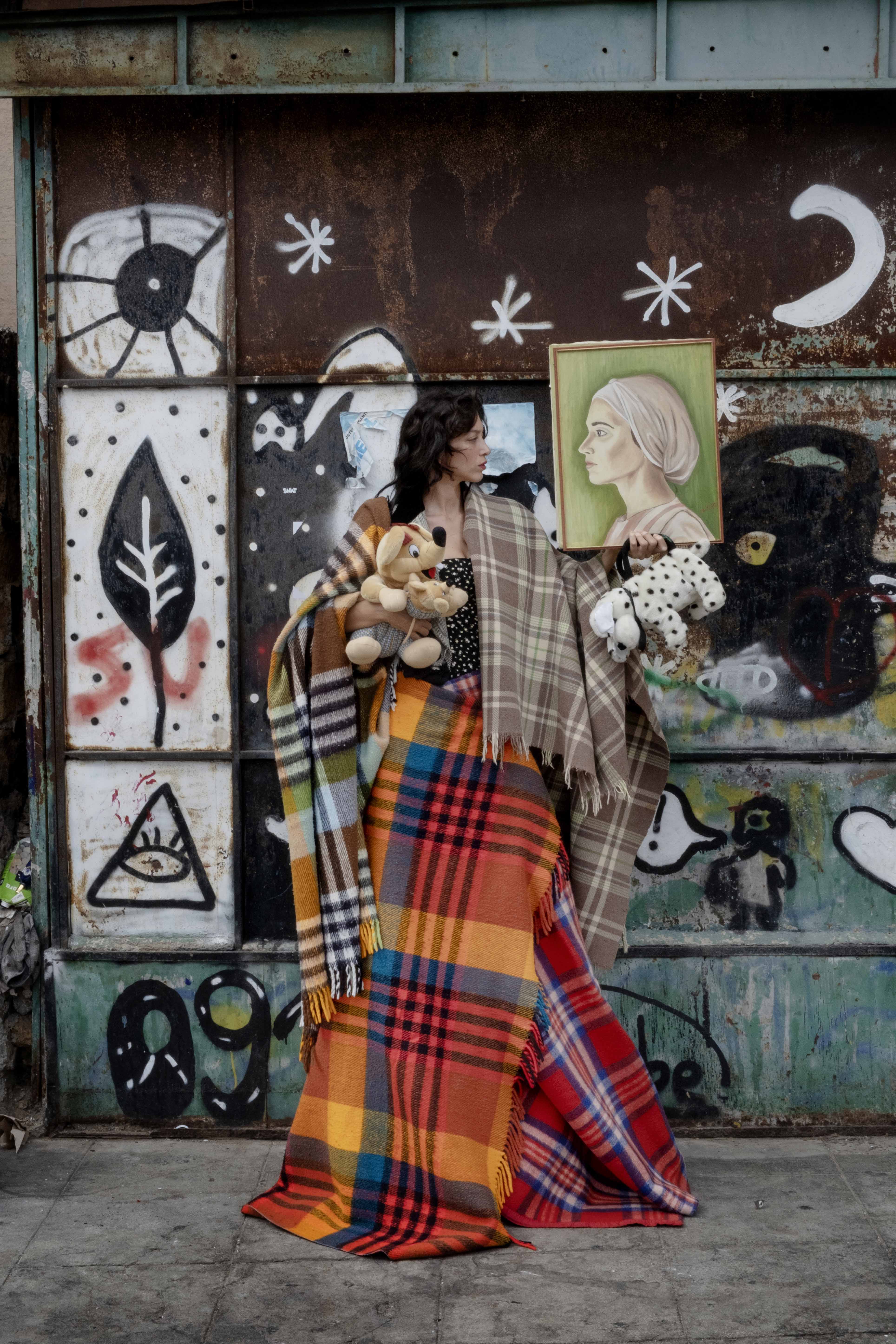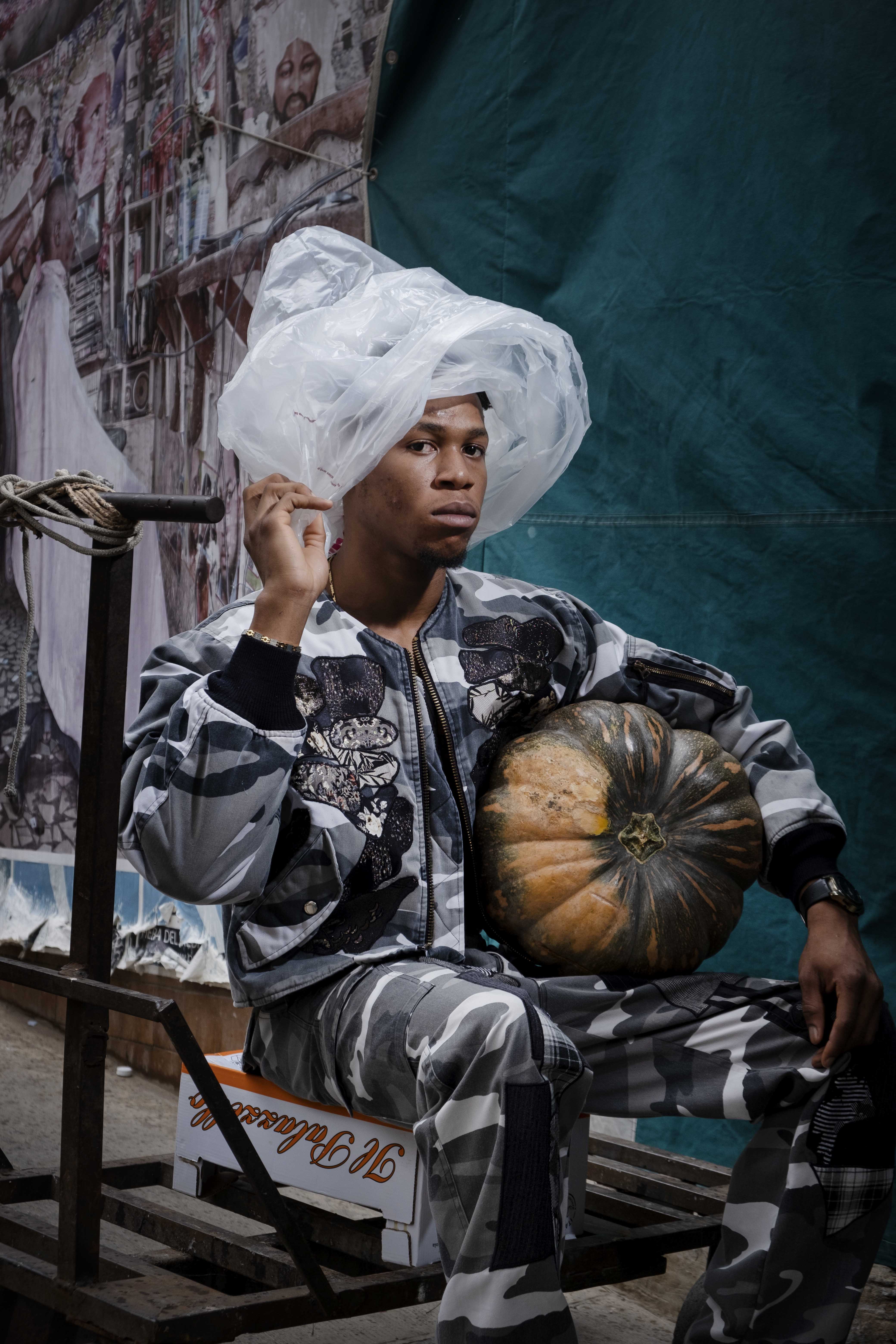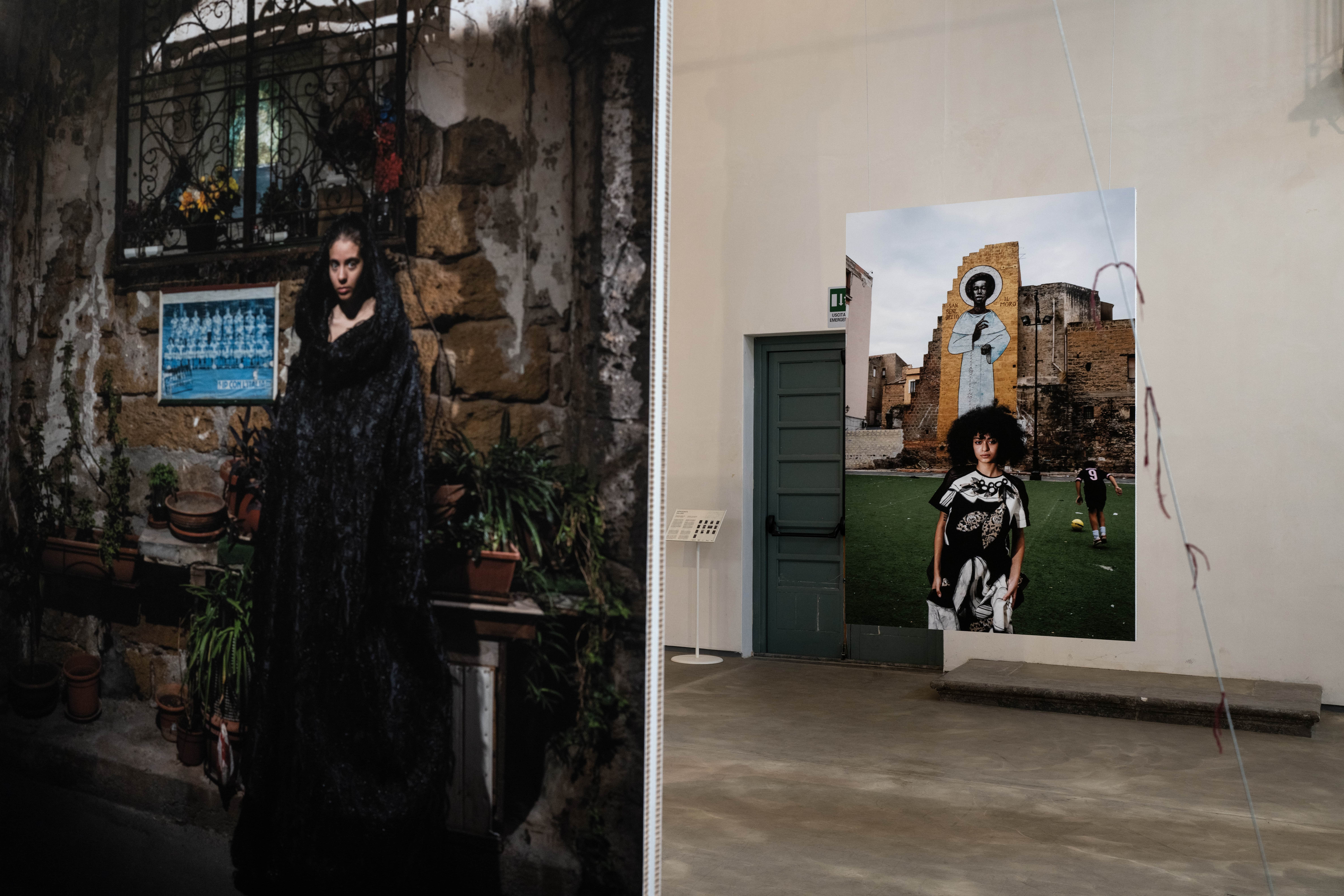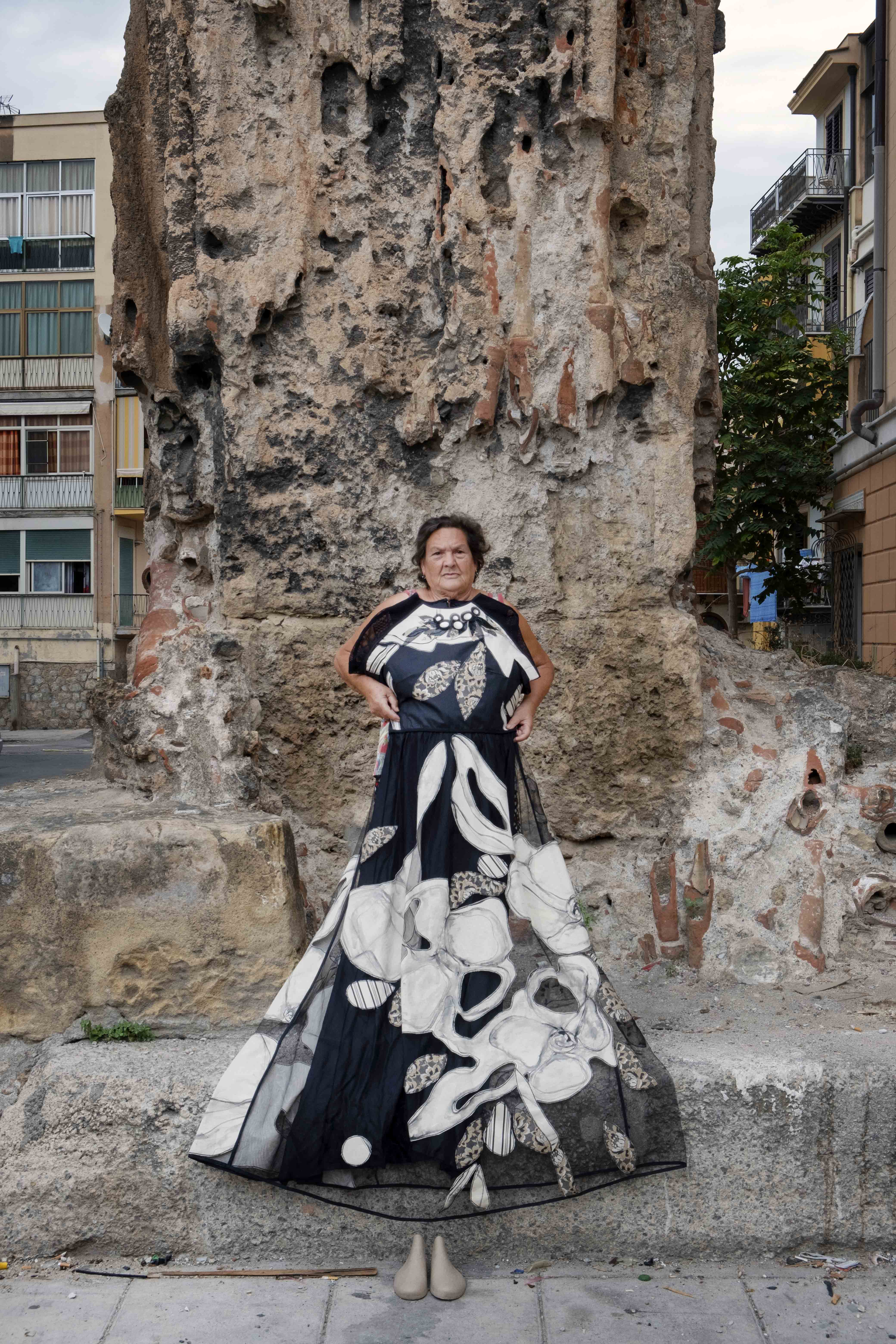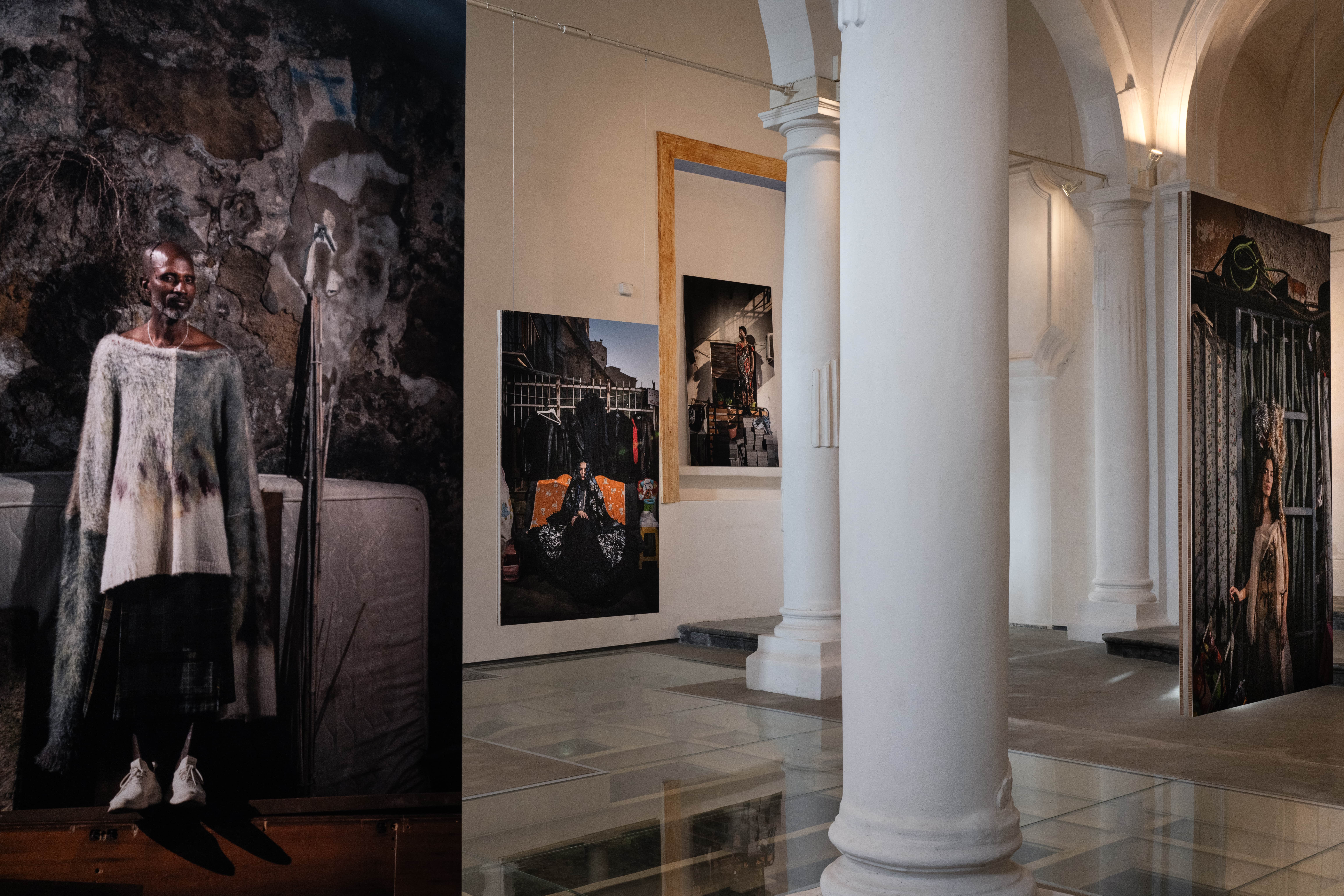 Le creazioni stilistiche dell’artista sardo fungono da pretesto per generare una ribaltata e intensa connessione con Ballarò, che nelle dirette ed eleganti fotografie di Bellina fa da scenografia vissuta e reale ad un racconto fortemente animato da sguardi, sorrisi, posture, ma soprattutto da tutti quei props ormai naturali del quartiere che evidenziano emarginazioni territoriali e particolari e compromesse condizioni sociali di luoghi apparentemente lontani.