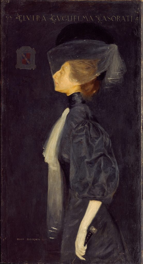 Casorati inizia a dipingere nel 1901, all’età di 18 anni, quando la pittura è per lui il principale strumento di cura a seguito di un esaurimento nervoso vissuto al tempo degli studi liceali. I genitori sostengono l’inclinazione del loro unico figlio maschio, affidandolo agli insegnamenti del maestro Giovanni Vianello. Risalente al periodo giovanile, la mostra esordisce con il celebre Ritratto della sorella Elvira, definito dal pittore «il mio primo quadro», nel quale la posa distinta della donna, ritratta di profilo, il nome inciso sullo sfondo a caratteri dorati, e il blasone nobiliare, rendono omaggio alla ritrattistica antica ed esprimo al contempo un lessico già personale e consapevole.