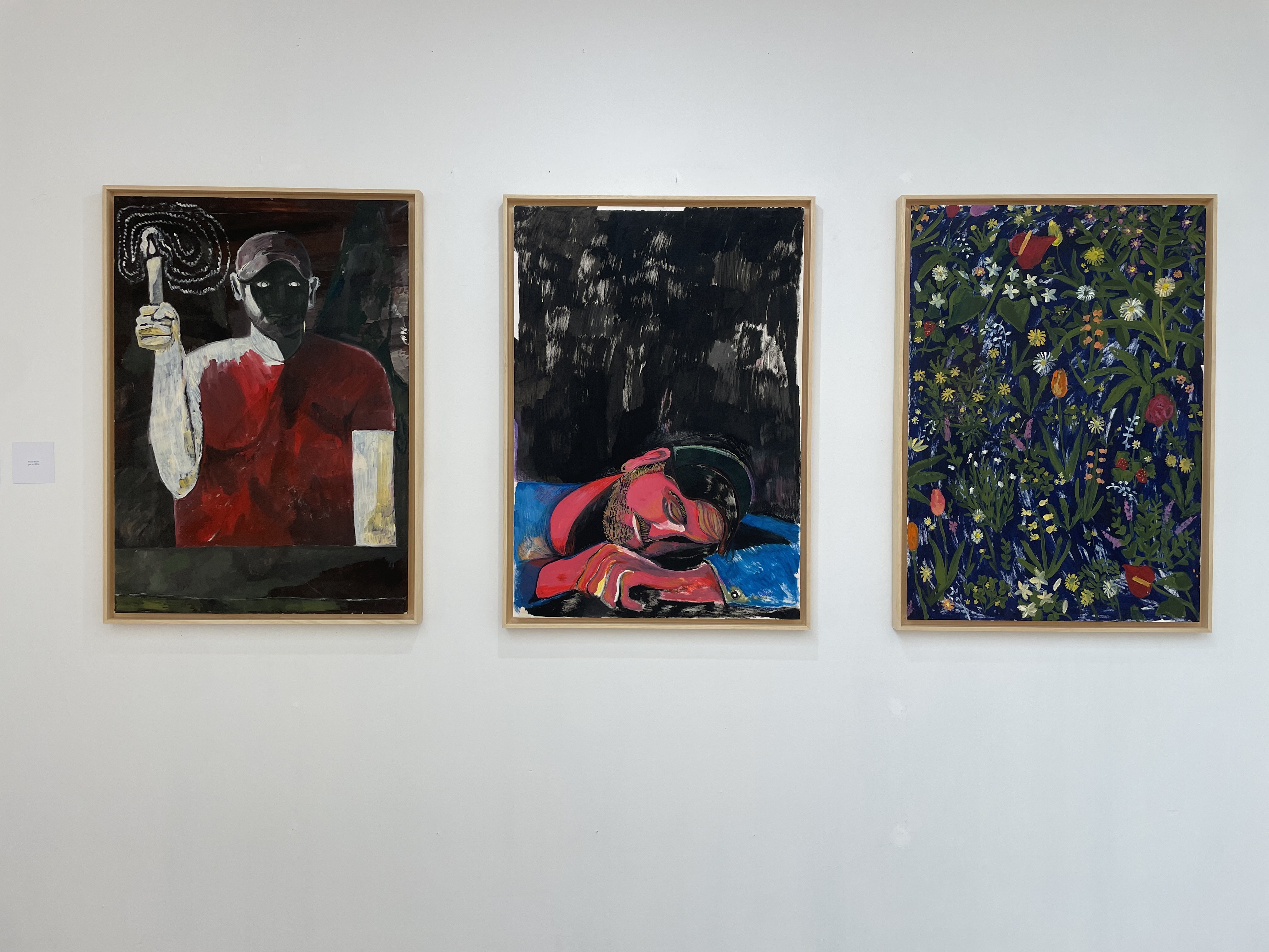Nicolò Bruno riporta a una dimensione più raccolta, casalinga e quotidiana. Il tris oscuro Lucifero, no cap e per te non lascia scampo nella sua claustrofobia. I rossi, i gialli e i verdi scuri sono destinati alle rappresentazioni dell’intimità domestica. Le figure umane sono predominanti: in Ponente e Maestrale il protagonista è in balia del vento, nel primo cerca di combattere e ripararsi, nel secondo cammina rassegnato. Il rosso passionale predomina in Ad Agosto, Milano e t’amo, t’amo. Il bagno, lo spazio dove si elaborano i pensieri, è lo scenario di Cruising (un riferimento al film di William Friedkin?) e Verme. Al centro della parete due finestre: pioggia sempre e Cremia dove la figura umana che guarda verso l’esterno vede sgretolarsi ancora una volta le proprie certezze. Mezzogiorno vede un contemporaneo San Sebastiano in un ambiente aperto dalle tinte più delicate, l’unico di questa composizione, forse un bel ricordo. Malelingue riporta alla dimensione terrena e cittadina. In Vernissage il verde acido predomina, confondendo i piani.