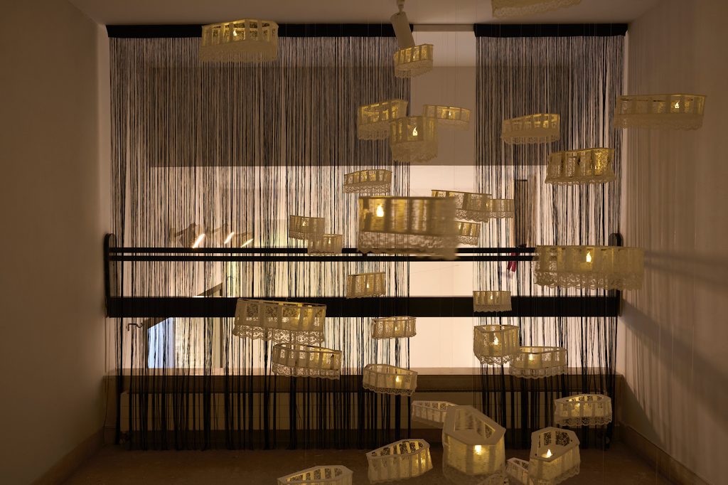Al piano superiore, le sue culle-bare, delicate e brutali metafore di un nido negato, sono avvolte dai merletti di Burano lievemente bruciati, come se ogni filo avesse assorbito il dolore delle generazioni. Queste opere sono sudari di un passato che non può essere sepolto, come un corpo lacerato che, pur ricucito, non smette di sanguinare. Germain trasforma la cicatrice in arte, che, nel suo straziante sussurro, cura.