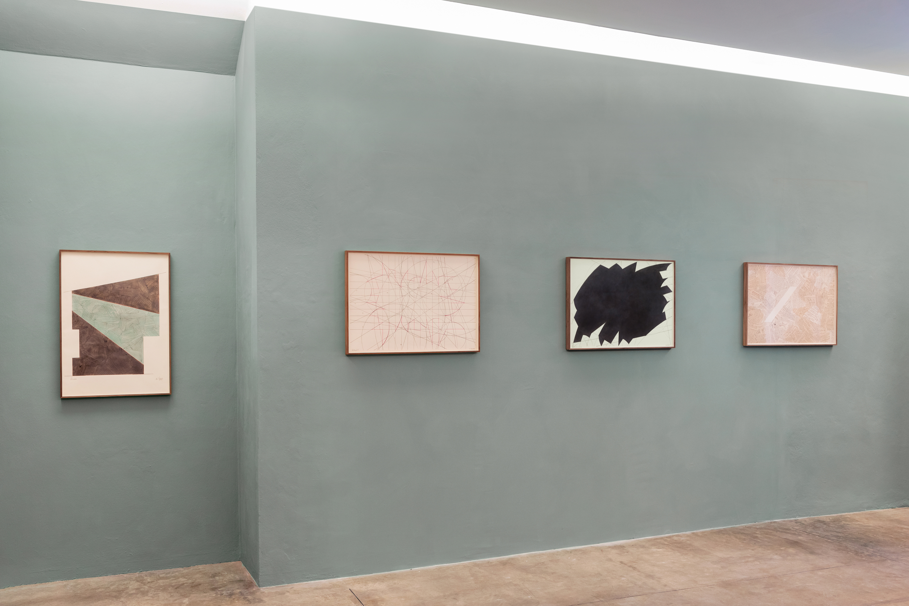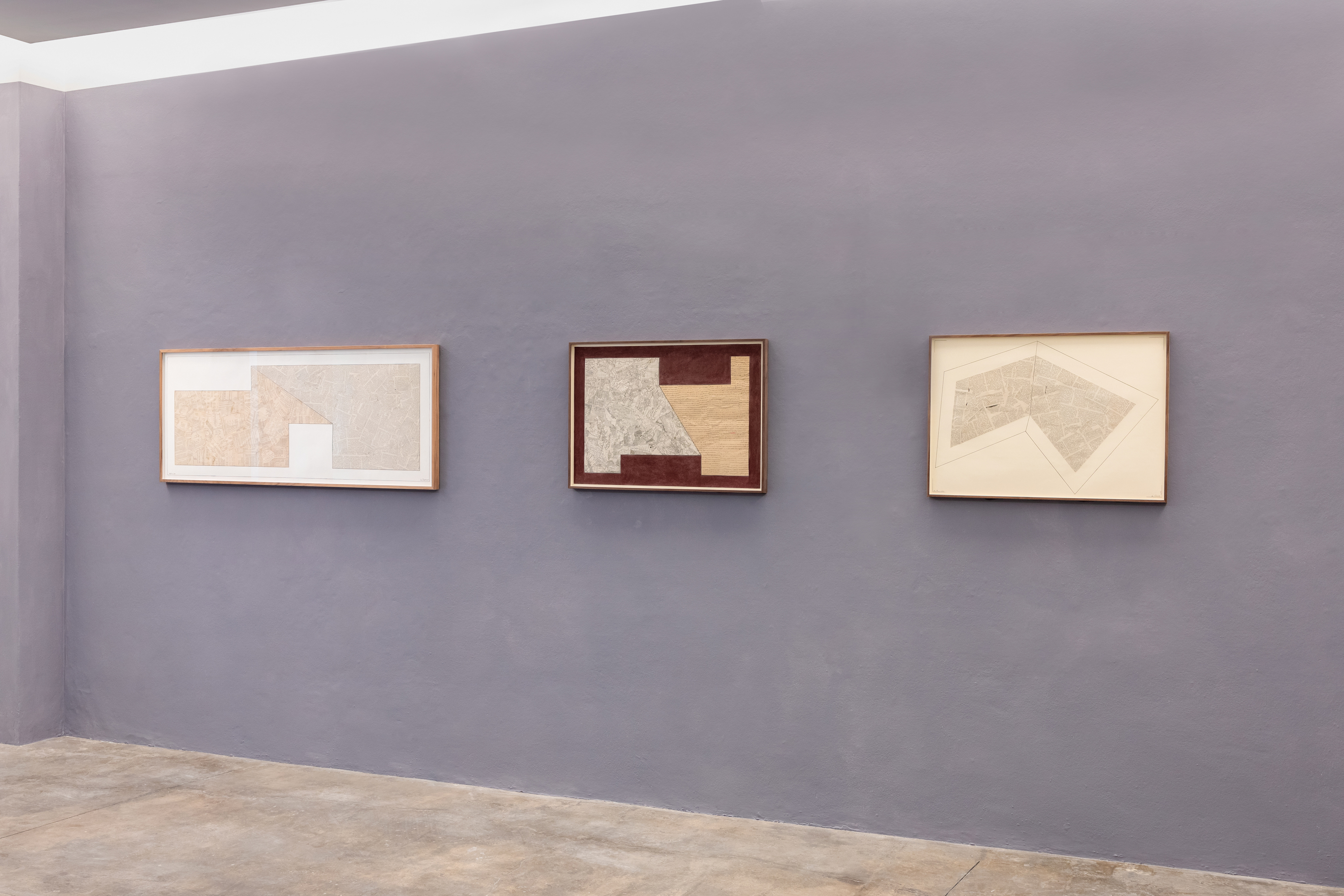 Seguendo questo nuovo approccio al lavoro, la galleria è stata “divisa” in tre momenti, idealmente testimoni degli ultimi tre anni, durante i quali l’artista ha dovuto “allontanarsi” dalla propria idea di viaggio. Attraverso un nuova produzione di opere su carta – risultato di una riflessione sull’utilizzo di nuove forme geometriche e livelli materici che spaziano dall’inserimento di mappe a scritte a mano – il lavoro meticoloso di Tremlett viene fuori con estrema delicatezza e minuzia, portando nuova forza vitale con un produzione che sembra attingere da un’estetica del passato con nuove consapevolezze sul presente che rivolgono lo sguardo al futuro.
