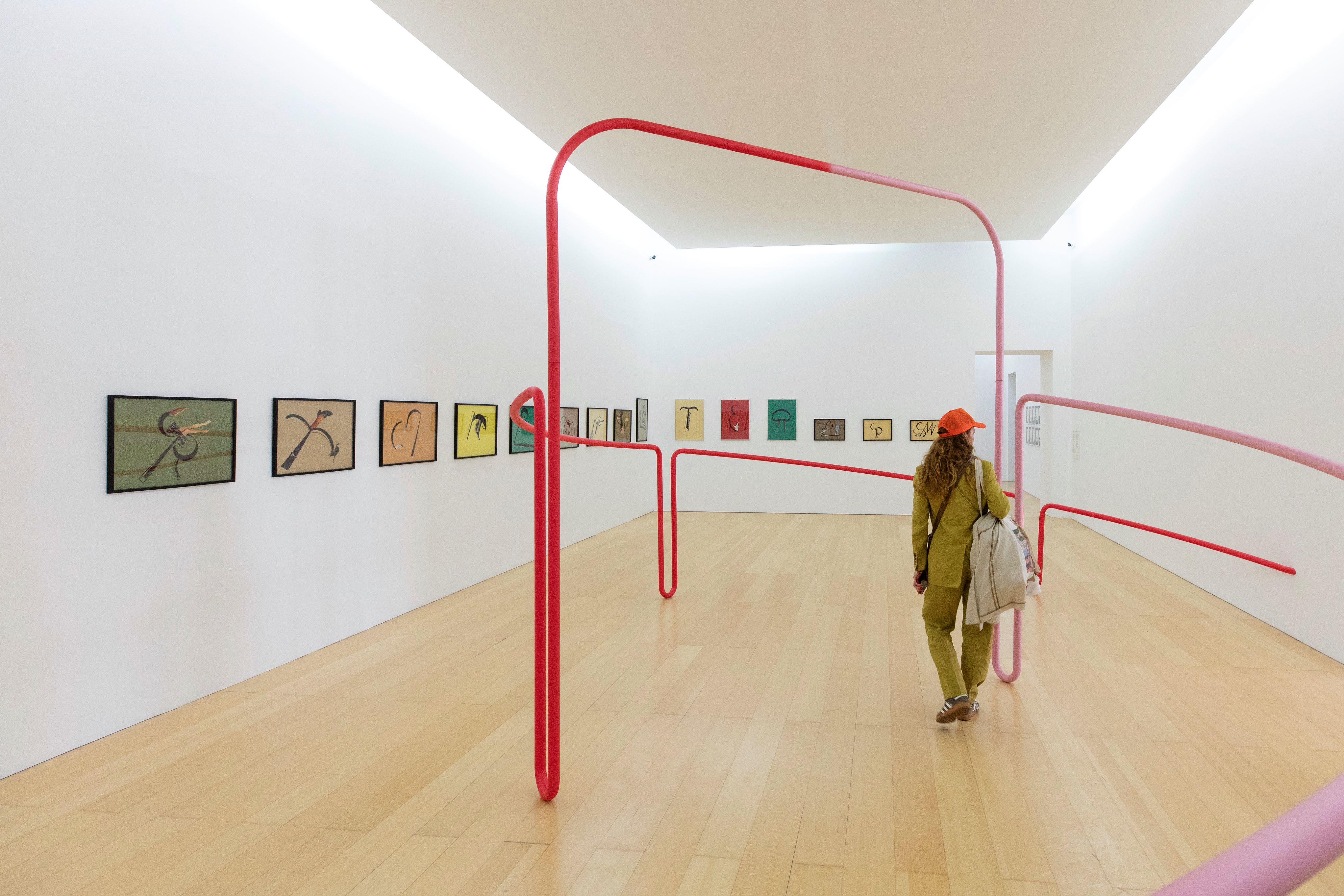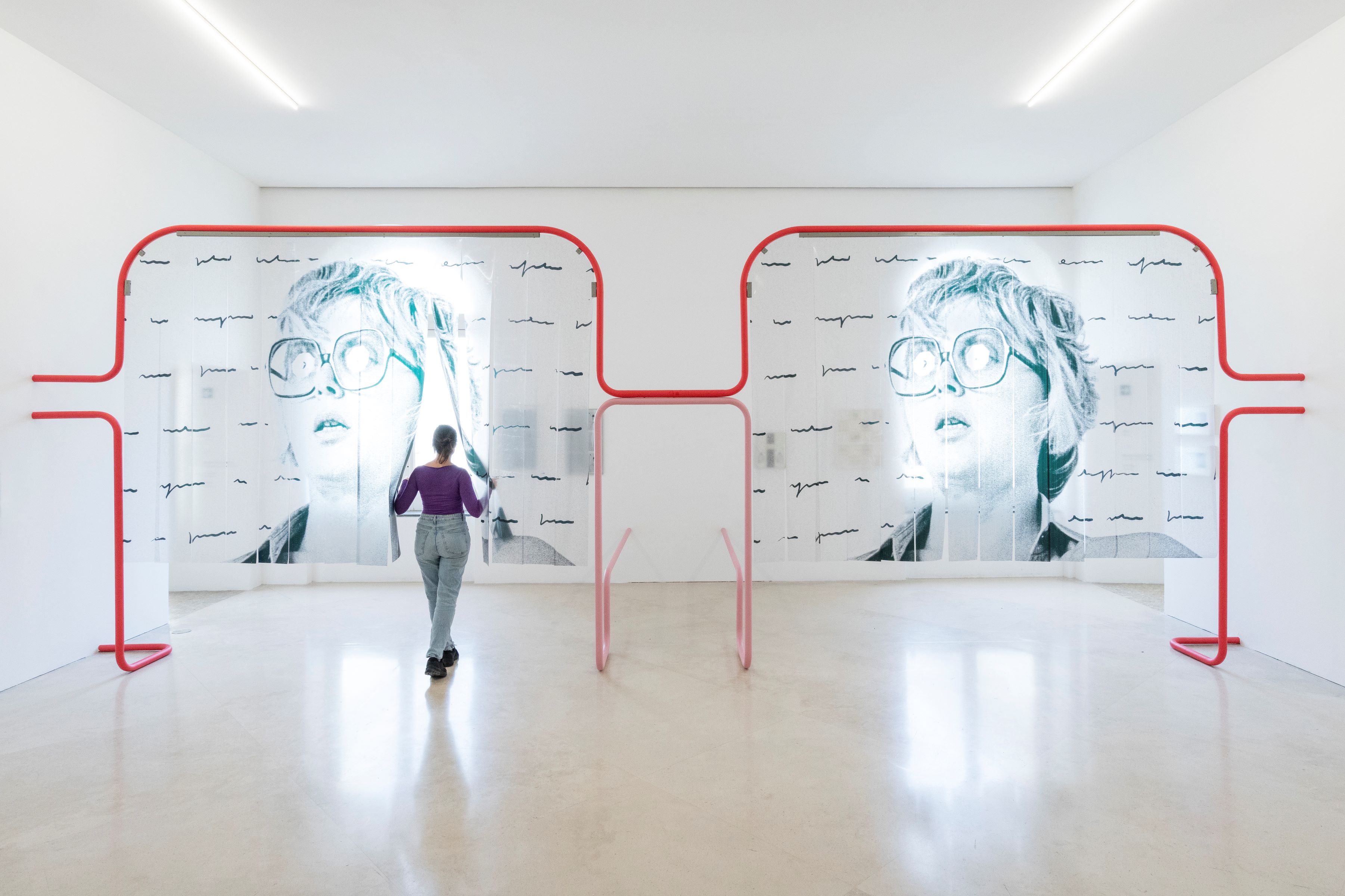 Ogni esito della ricerca di Tomaso Binga è contrappuntato dal filiforme e diffuso allestimento sperimentale progettato dal collettivo Rio Grande. Un elaborato dispositivo liminale, un “parergon” — termine che vale la pena utilizzare rievocando la prospettiva di Jacques Derrida, opportunamente citato da Stefania Zuliani nel raccontare l’esperienza del Lavatoio Contumaciale, come cornice nella quale Binga compone l’attività di quegli anni in un Autoritratto di gruppo, da cui il titolo del contributo dell’autrice, presente nel volume che affianca l’esposizione, curato con Lilou Vidal, Eva Fabbris e Anna Cuomo (Lenz Press, Milano 2024) — che penetra e riemerge in ogni pagina espositiva, su tutte le superfici. Quanto descritto da Derrida incontra qui una significativa assonanza se si considera che le soluzioni allestitive di Rio Grande, oltre a essere concepite secondo un più immediato «Criterio di affinità» e «Continuità», possono agire nel senso più profondo dei “parerga”: cornici che proteggono «Da quel che manca», da quell’assenza «Che non ha luogo», indefinibile ma colmabile, tra noi e quella «Energia libera e piena e pura e scatenata» dell’opera d’arte e che pulsa con eguale intensità nella pratica di Tomaso Binga.