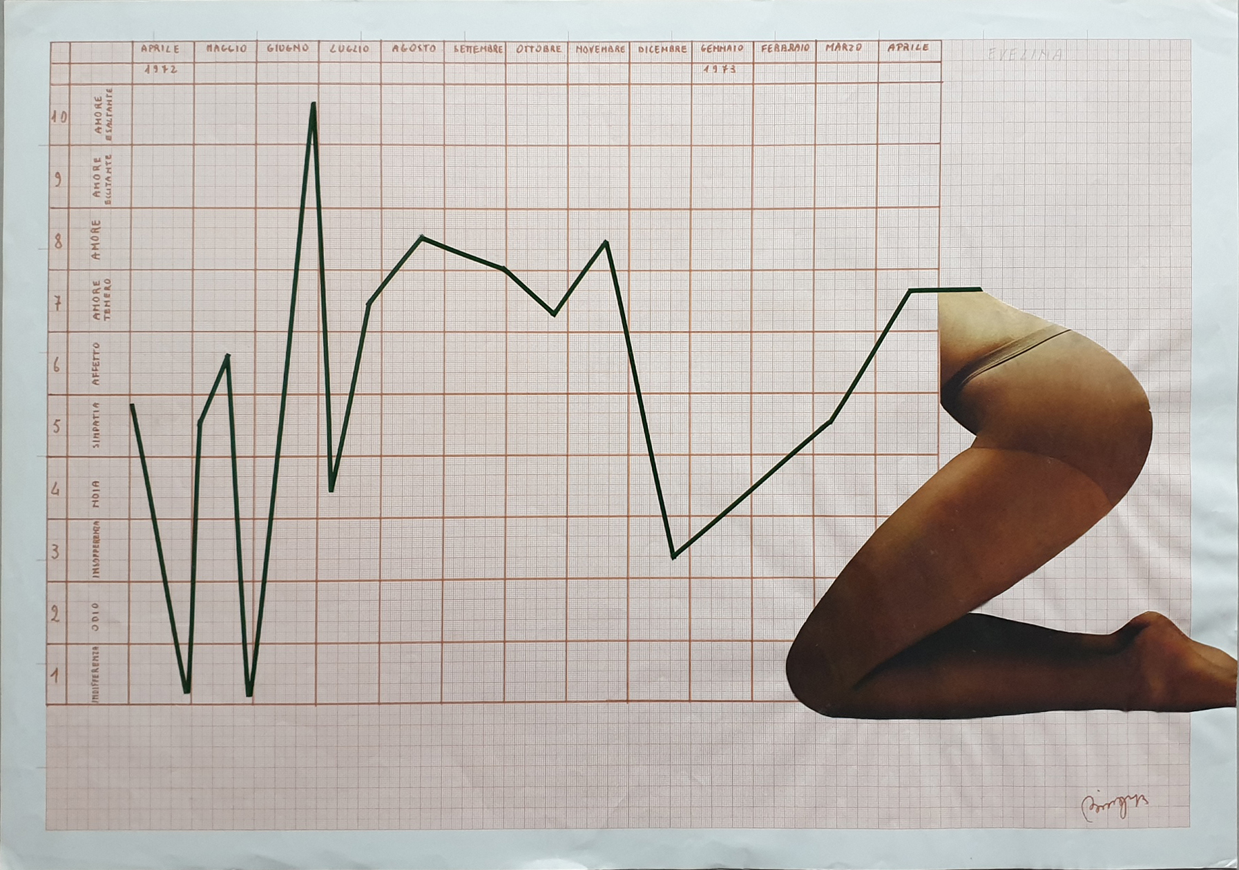 Il segno corre e si inerpica in una stessa sala: un calligrafico movimento abita le enigmatiche giustapposizioni dei Ritratti analogici (1972-75) per poi divenire “cardiografico” nei frastagliati Grafici di storie d’amore (1972-73), dove sono registrate le fluttuazioni emotive di un rapporto amoroso nel tempo, dall’indifferenza all’amore esaltante. Questi alcuni tra i numerosi lavori in mostra, capaci di testimoniare la varietà di materiali e soluzioni formali che l’artista ha attraversato nel tempo: dalle riflessioni sulla materia, prelevata e risemantizzata, alle dimensioni performative e visive del corpo e della voce.