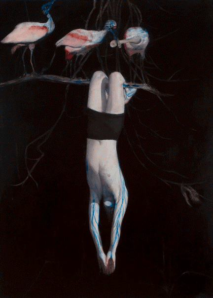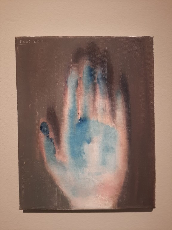 Nella prima sala un piccolo quadro raffigura una mano sporca di vernice blu (Dirty Hand, 2009) e sembra essere la matrice della mostra, l’inizio del racconto di Alexander Tinei. Tutti i corpi che dipinge, infatti, sono attraversati da tracce blu su braccia, gambe e viso. Potrebbero sembrare vene o segni tribali, ma come suggerisce Tinei stesso sono indicatori di emozioni, simboli fisici di un dolore latente.