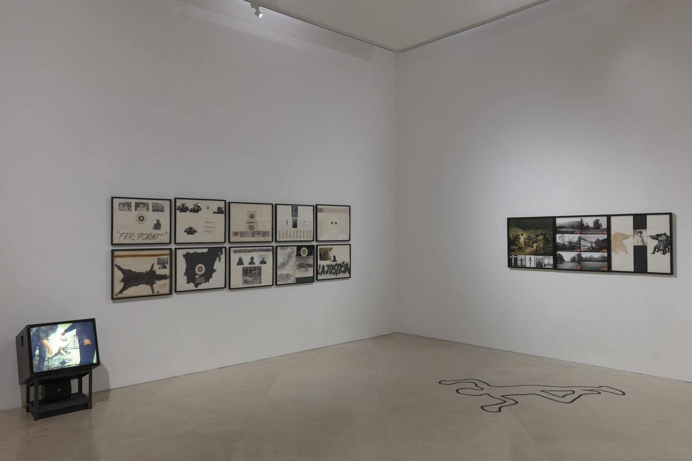 Il percorso inizia proprio con questa installazione, Images del zoo, esposta per la prima volta nel 1974 alla Sala Vinçon di Barcellona, all’interno di un negozio di design. Miralles, in primo piano, è chiusa in una gabbia con una serie di animali “domestici”, mentre sulle altre pareti campeggia una serie di foto di animali, questa volta “selvatici”, intenti a guardarli. L’idea è quella di cambiare e invertire il punto di vista, di indagare e soffermarsi sul concetto di opera d’arte e di normalità, qui messi sotto accusa, in tutta la loro teatralità artefatta.
