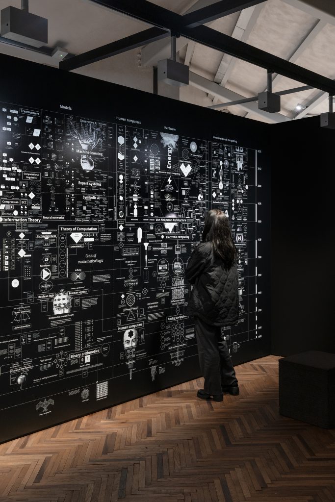 La mostra occupa tutti gli ambienti dell’Osservatorio di Fondazione Prada e si sviluppa quindi su due piani: il primo piano mostra una sorta di teatro anatomico dell’intelligenza artificiale, concentrandosi sulla dimensione spaziale; il secondo piano accoglie l’ambiente buio e immersivo della stanza delle mappe, approfondendo la dimensione temporale.