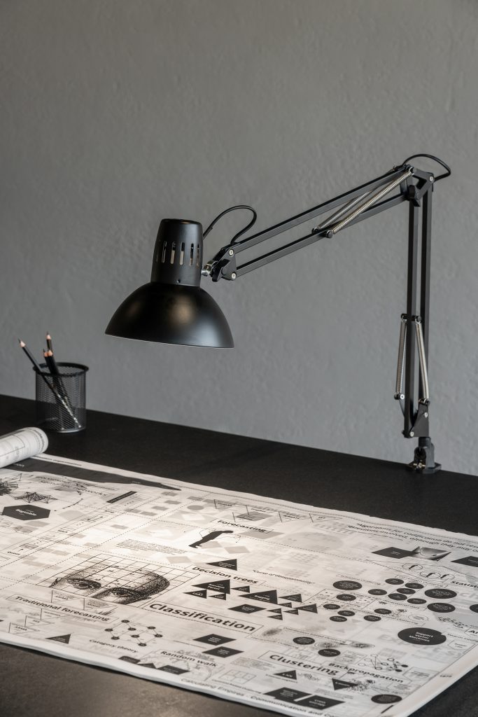Nel secondo piano si trova la stanza delle mappe, che si presenta come un dittico contenuto fisicamente in una scatola nera. Nella parte sinistra si trova la mappa dedicata alla Comunicazione e alla Computazione, mentre la parte destra è dedicata al Controllo e alla Classificazione. In entrambe sono stati selezionati i momenti, le idee e le infrastrutture che mostrano l’evoluzione sinergica di questi sistemi. Nel resto del piano è stata esposta parte della documentazione fisica utilizzata, come libri, carte geografiche storiche, calcolatrici. Inoltre, a disposizione dei visitatori, c’è una copia cartacea delle mappe di Calculating Empires, su cui ciascuno può scrivere segnalando degli approfondimenti. Proprio quest’ultimo elemento è indicativo della gestione collettiva del progetto: non solo per gli innumerevoli esperti che sono stati coinvolti, come ingegneri, grafici, filosofi, storici dell’arte, matematici, ecc., ma anche per l’interconnessione tra gli esseri umani e i protagonisti dei processi tecnologici e di potere che Crawford e Joler fanno emergere attraverso le loro mappe.