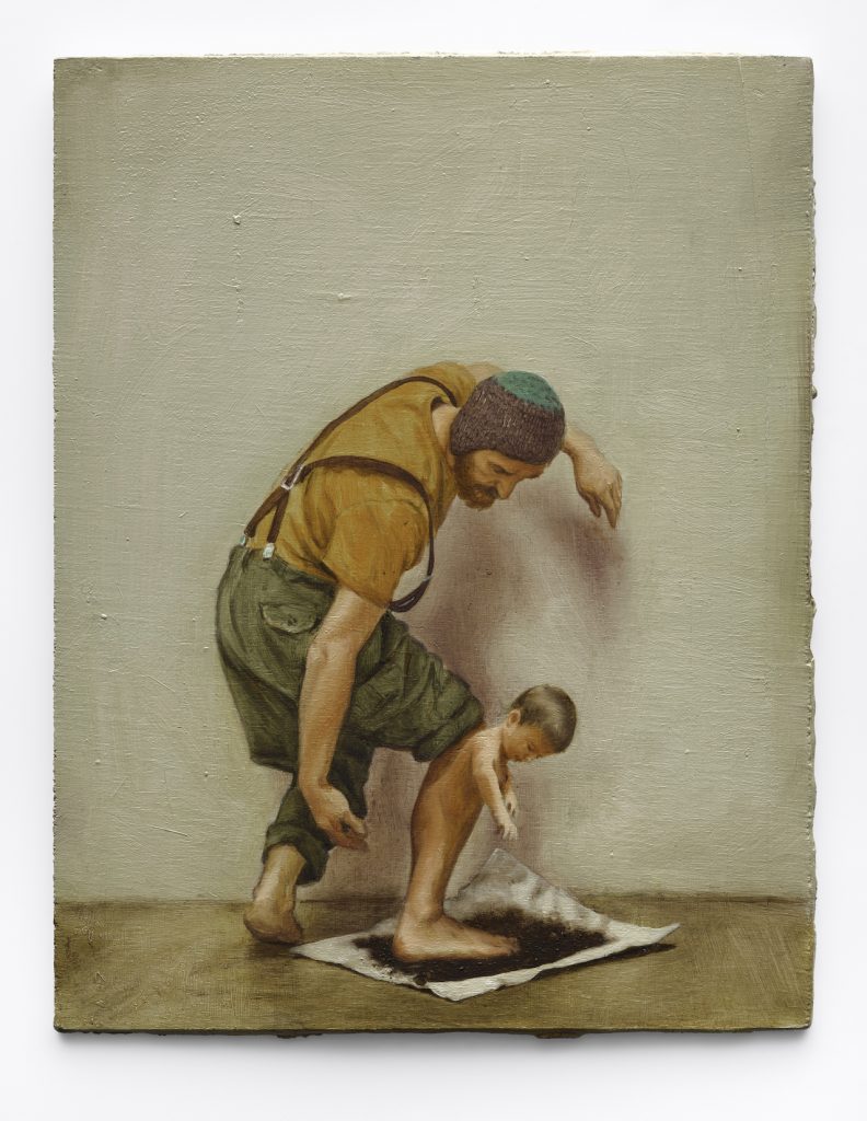 Rassomigliante, così tanto, da essere lui. Eppure, non sono autoritratti: Cerutti usa infatti la propria figura – che senza dubbio è quella di cui ha maggior conoscenza – come un carattere universale sottoposto a un costante processo di verifica e di moltiplicazione, di trasformazione e di deformazione (cognitiva e formale, ben visibile), che lo rendono vulnerabile. Come potrebbe essere un padre, per esempio, in una determinata situazione. Del resto, Cerutti, è un padre ed è proprio l’esperienza della paternità, autobiografica, intensa, ad aver ispirato la sua attenzione verso la creazione di un’entità che assume, inaspettatamente, sembianze infantili e di cui ambisce la conoscenza, che è primigenia e asimmetrica e precede ogni definizione.