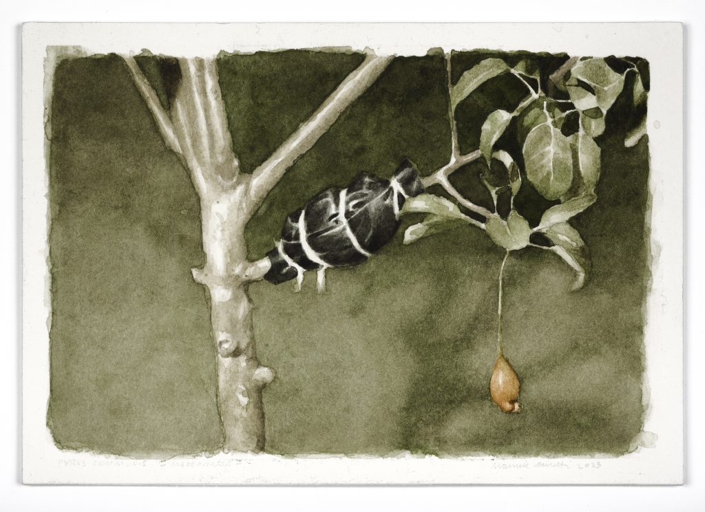 Guardare queste opere, le tele della Pattern Room e in ingresso della Collezione la quadreria di disegni «non bozze preparatorie – avvertono Sara Piccinini e Manuele Cerutti – ma possibili espansioni di un racconto», significa saper passare da un livello all’altro distinguendo, senza distruggerli, tutti gli infiniti strati che compongono ciascun lavoro. Umano, minerale, vegetale, animale e paesaggistico – che non è più, quest’ultimo, solo interno allo studio ma comprende cavalcavia, rovine industriali, terre incolte, sottopassi di cemento dei dintorni di Torino, dove Cerutti vive – viene, sulla tela, a costituire il visibile. Sfogliare queste immagini, strato dopo strato, comporta partecipazione e distacco, sensazioni di meriti e di colpe, tentativi di recupero e di rinunce. Si procede come l’umano dell’intima china su carta intitolata Lambda: asimmetricamente, da un livello all’altro, lasciandosi inciampare nello stupore per creare sempre nuove relazioni con il proprio stare nel mondo.
