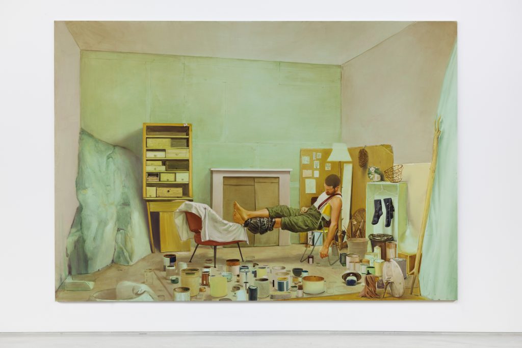 La creazione cui assistiamo in tele come Meriti e colpe, La traversata e Necessaria seconda capriola – le prime due di grande formato e tutte tre esposte nella Pattern Room – è inconsapevole, forse involontaria, e ha origine da una ferita su una gamba, di cui il soggetto universale ha costante cura, anche con un fare quasi magico, un po’ sciamanico, servendosi di erbe naturali (Ramo delle confluenze) o avvolgendola con un telo (Perdere l’eroe conservare la ferita), perché la ferita è feconda, è materia germinativa che si dà come insorgenza di altre vite e direzioni. Siamo nel regno, allegorico e mitologico, della partenogenesi, ovvero un tipo di riproduzione in cui la cellula-uovo è slegata dall’atto fecondativo che si richiama, per consonanza, a un metodo di riproduzione agamica, che in botanica prende il nome di tecnica della margotta – che consente di ottenere nuove piante scortecciando una parte di un ramo e racchiudendolo, dopo averlo circondato di terra, in un telo per pacciamatura di plastica nera: lo stesso che vediamo annodato intorno alla gamba dell’umano raffigurato (anche) in Tutte le mani dormono – l’ultimo lavoro in termini di realizzazione, che ha il sapore di una contemporanea Deposizione.