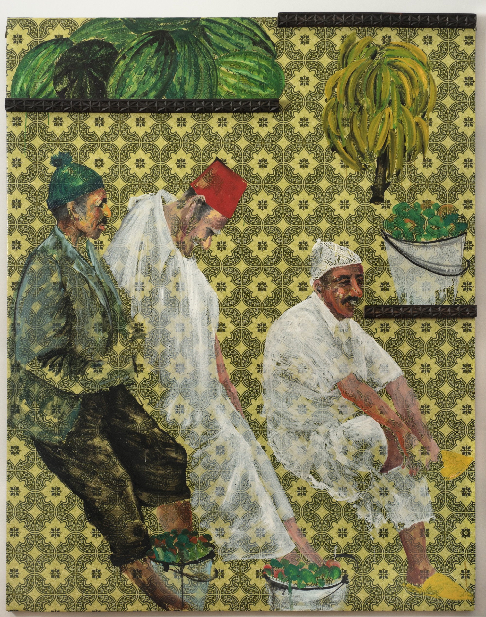 Anche opere in mostra alludono all’impatto che i viaggi compiuti dall’artista, in senso metaforico oltre che fisico, hanno avuto sullo sviluppo del suo lavoro. Mondino ha sempre accompagnato questa sua flânerie con la curiosità e l’ironia che sono la cifra stilistica del suo lavoro, traducendo in termini mondiniani ciò che aveva visto durante le sue peregrinazioni. A partire dagli anni Ottanta, gli spostamenti si intensificano, mettendolo di fronte a quello che lui stesso definisce «un Oriente che comincia dal Marocco e prosegue in Palestina, dove intravedo un affascinante parallelismo tra la preghiera e l’intensità dell’attenzione nel dipingere in modo concettuale.» Da quest’analogia tra spiritualità e gesto pittorico nascono le opere dei Dervisci, soggetti danzanti dipinti su linoleum. I dervisci praticano la danza rituale caratteristica della tradizione turca eseguendo movimenti fluidi e circolari. Fondamentali sono gli incontri durante i suoi viaggi, Mondino raffigura mercanti e souk locali, la vera essenza della città, un mercato capace di rivelare l’anima di un paese: ne cattura le fisionomie dei soggetti e i colori della frutta intervallati da pattern geometrici, punto di incontro tra la pittura figurativa di stampo occidentale e la sintassi decorativa geometrica di derivazione mediorientale e asiatica.