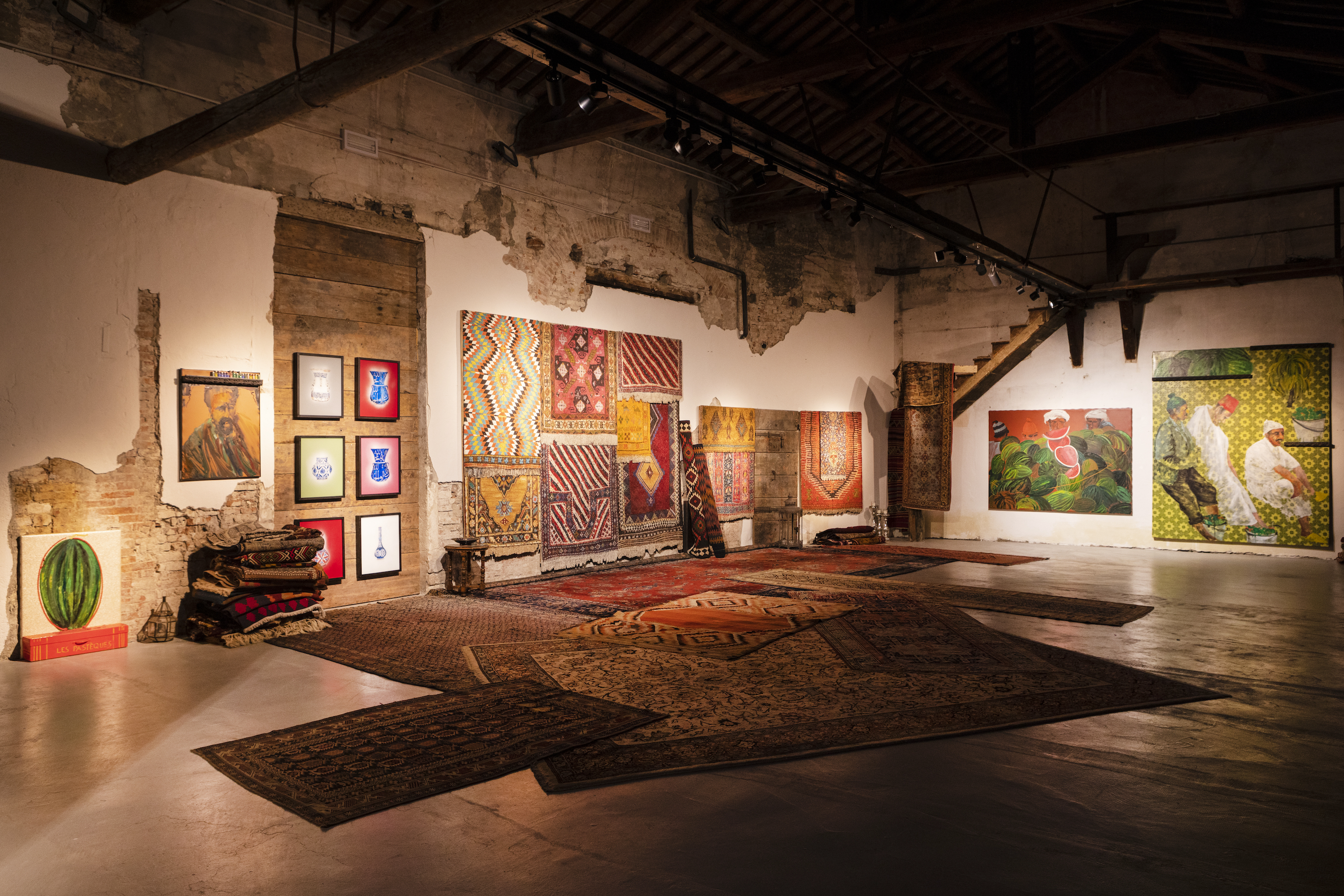 Una rivalutazione della materia vale anche per Iznik, la tecnica dello smalto su vetro che vuole ricordare i manufatti in terracotta della città turca Nicea: in questa serie di lavori la pittura diventa ceramica, traendo in inganno lo sguardo in questa metamorfosi della pittura che diventa altro. Lo stesso trompe l’oeil dei tappeti stesi e appesi alle pareti come panni messi ad asciugare, vengono realizzati con colori vivaci su un materiale edile industriale, l’eraclite.Un’illusione che sfiora la perfezione e con questi lavori l’artista ci tramanda una narrazione composta da colori vividi e motivi decorativi di un affascinante universo sconosciuto.