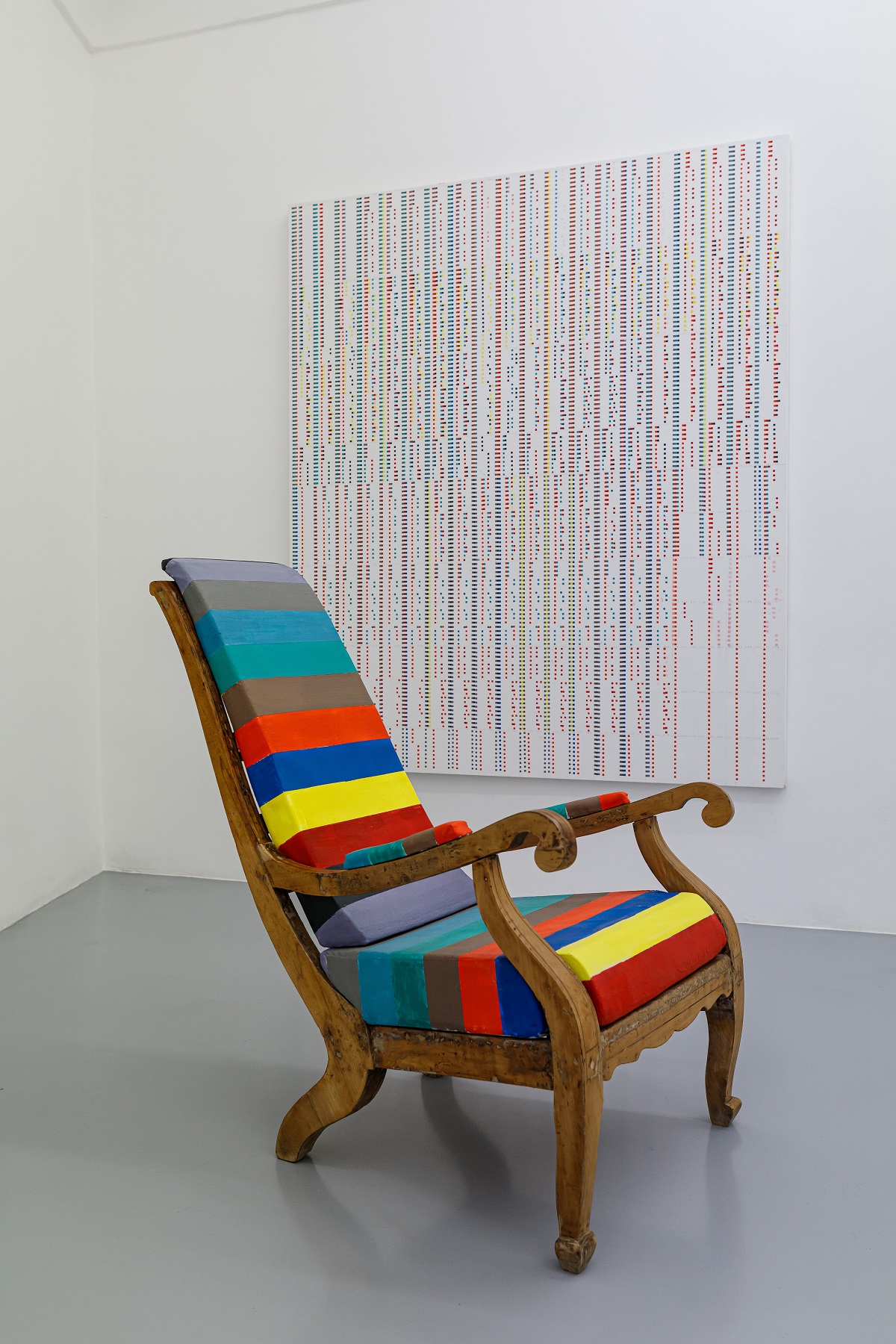Apparentemente i due mondi sembrano quindi slegati: quello dell’equazione cromatica-numerica del quadro e la natura grezza della potatura degli alberi. Ma nell’ultima stanza questa distanza viene ribaltata, per mettere in evidenza il raccordo tra il concetto di esterno e quello di interno. Formalmente, il punto di congiunzione sembra essere rappresentato dalla chaise-longue del contadino colto, in cui rintracciamo un riferimento alla vita di campagna: la sedia è stata trovata in una dimora rurale ed è stata ridipinta con i colori della tavolozza tipica dell’artista, i tre primari, per poi passare al rosso-arancio, marrone, verde petrolio, azzurro, grigio, violetto e nero.