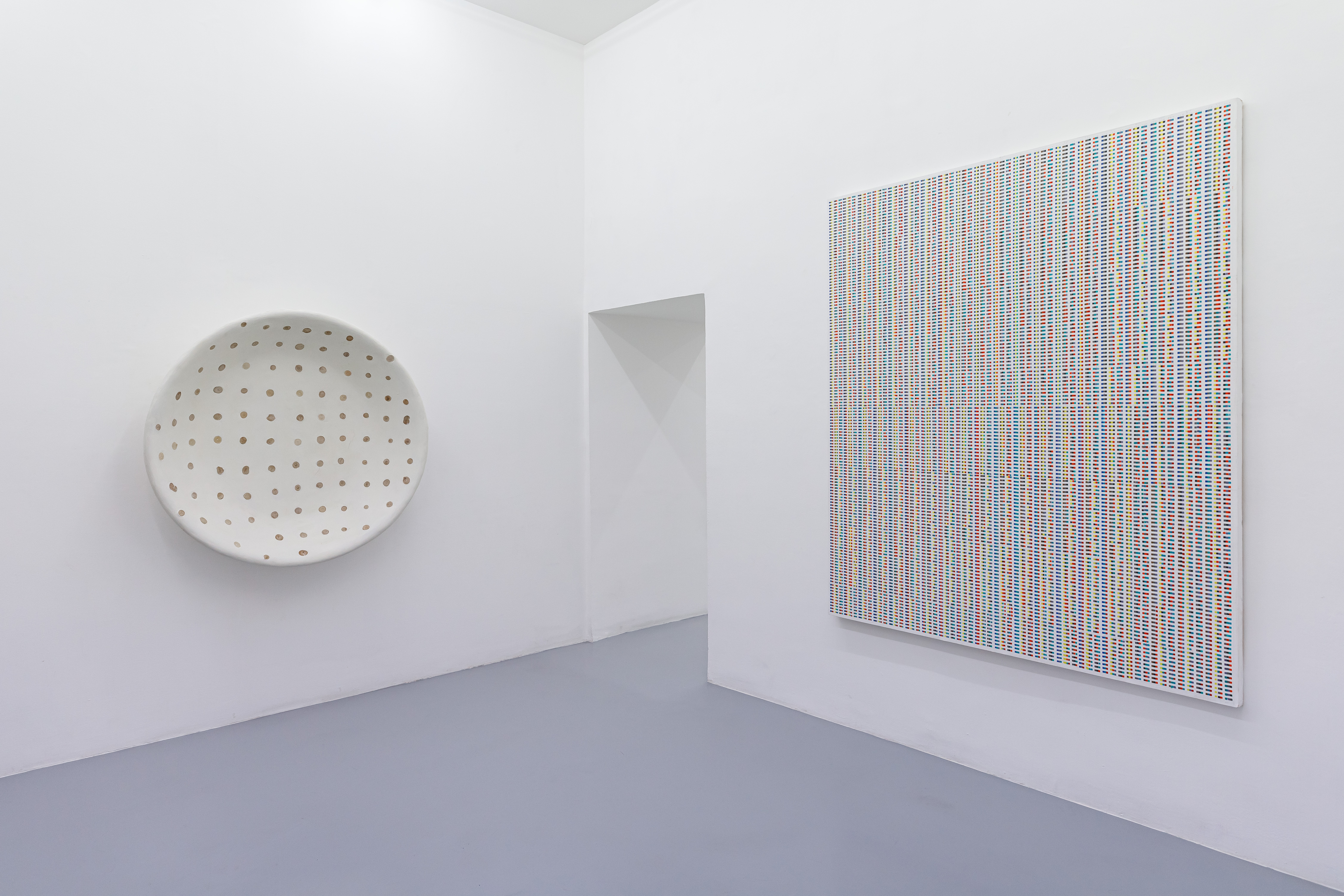 Nella prima sala della galleria ci viene mostrato il lavoro metodico, quasi astratto, che l’artista compie nel suo studio e che appartiene, quindi, alla sfera interna. Infatti è possibile scorgere il quadro B, nel quale l’artista ha completato le duemila ottocento combinazioni dei dieci colori (che utilizza nei suoi lavori) e tre trittici: a ogni colore corrisponde un numero stabilito dall’artista. Giliberti ha iniziato a studiare le cromie – e infatti definisce il suo studio una fabbrica di colori – per poi arrivare, nel 1992, a stabilire il suo alfabeto cromatico di dieci colori specifici, che utilizzerà successivamente nelle sue opere. In totale l’artista ha prodotto cinque quadri combinatori, in mostra ne sono presenti tre.