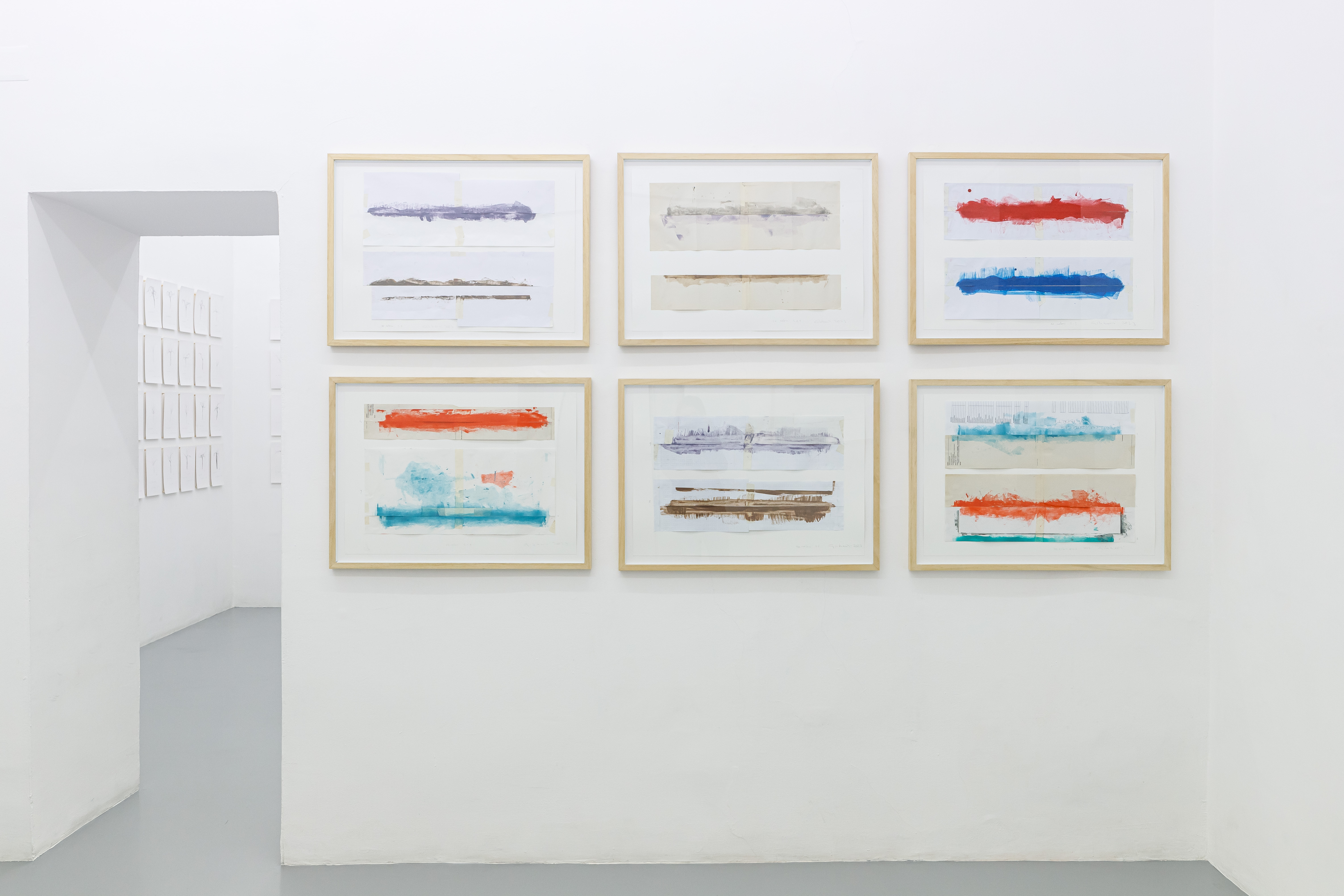 Nella stessa sala troviamo anche i Paesaggi specchiati, così come li definisce l’artista, composti da elementi di recupero provenienti dalla creazione dei disegni con le fasce colorate che identificano la posizione dei colori di ciascun quadro finale. Questi “paesaggi” sono dei pezzi di carta che servono a proteggere le zone del disegno che devono rimanere bianche. La risultante sarà quindi una sorta di negativo colorato. Ciò che resta, lo “scarto”, diviene oggetto che parla direttamente all’artista.