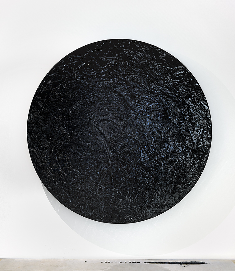 In questi lavori l’intervento, l’atto trasformativo determinato dall’operazione artistica, avviene attraverso l’incontro. Da un lato l’oggetto, dall’altro il confronto e lo scontro di questi oggetti fra loro. Questo è evidente in Violenza casuale, che può essere risolta come l’incontro e l’urgenza del rapporto artisticamente determinato, forte e di grande impatto, che mostra le conseguenze del contatto così come la sua irreversibilità, da cui siamo disturbati. È spesso un dialogo tra corpi e consistenze, tra diversi tipi di texture e differenti pesi messi in relazione. Sassolino accosta infatti il duro e il fragile, il trasparente e l’opaco, il pesante e il leggero, in un dialogo tra colori, forme e dimensioni, come in Sospensione della scelta, in cui la disparità crea quasi allarmismo e insicurezza, o in I.U.B.P., dove l’artista ritorna ad usare il pneumatico. In queste tante transizioni Sassolino sviscera l’atto, in cui vi è sempre uno scambio di energia, l’alternarsi di ordine e disordine nella dinamica dei corpi; sono relazioni fatte di confronti tra differenti reazioni e diverse inerzie, come nel caso di Ipotetica ma anche di Geografia del conflitto. Approfondisce le proprietà della materia, giunge a penetrare la loro natura più intima, riportandole ad un grado di essenzialità, alla parte fondamentale. Il suo processo artistico è un’indagine, intima e minuziosa, del reale che si unisce poi ad un’intenzione, in contesti dove l’opera esiste a prescindere e nonostante, come prodotto non più controllabile di uno scopo. Emblema di questo è l’ipnotica No memory without loss, centro nevralgico della mostra, che consiste nell’esplorare il comportamento dell’olio industriale che scivola, si accumula e cola a terra, come materia viva soggetta al movimento rotatorio del sistema elettrico. L’interazione tra le parti è data dal comportamento meccanico, in un costante scambio tra arte e fisica, interrogando le loro leggi e le conseguenze della fisicità delle forze applicate.