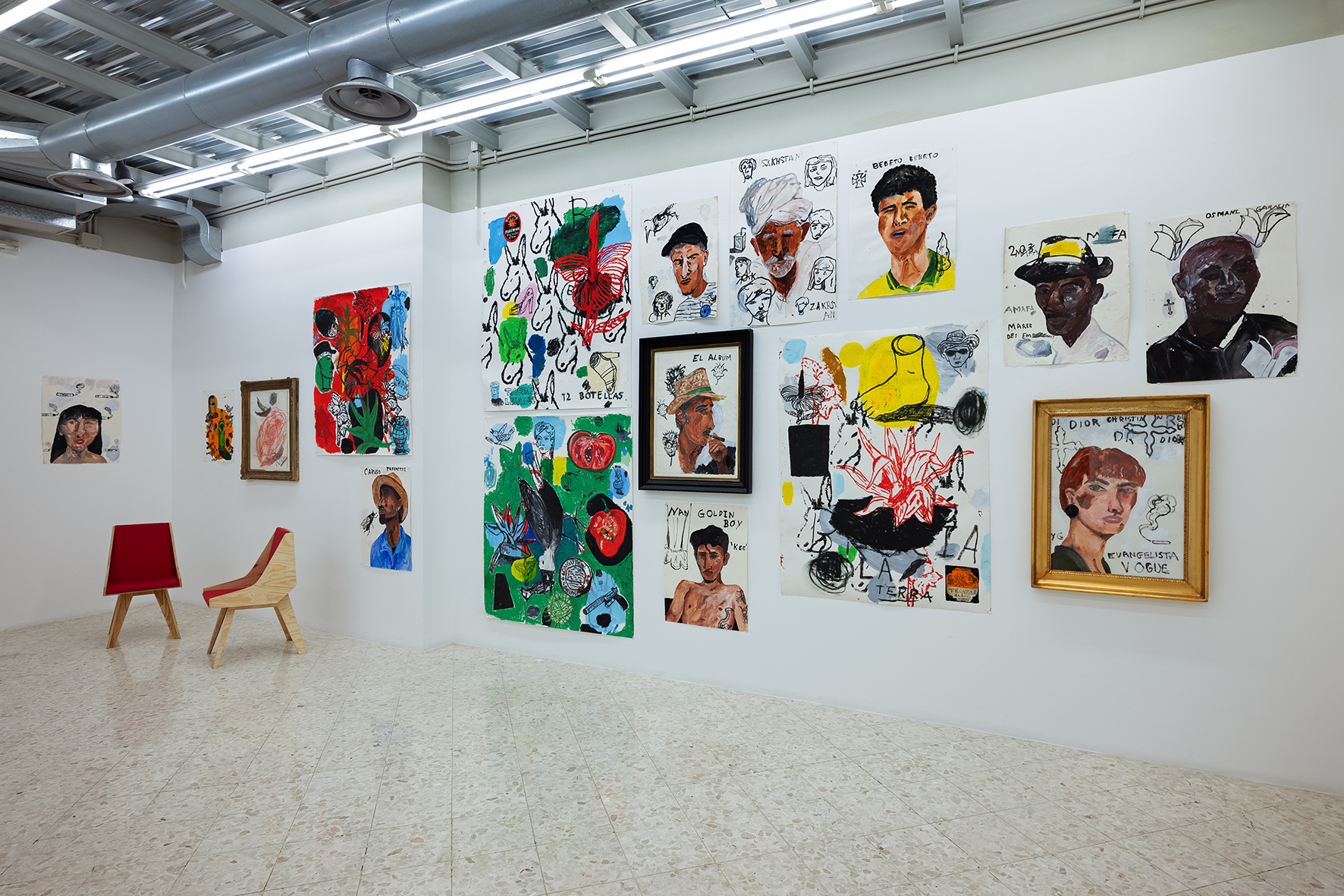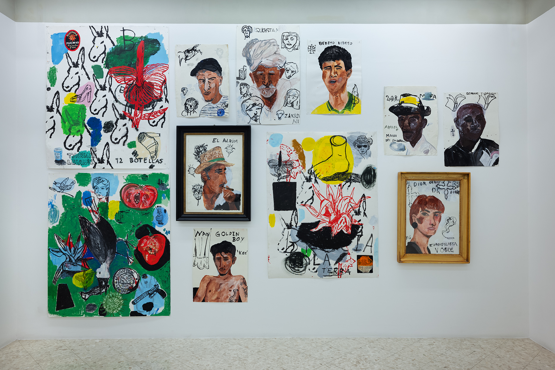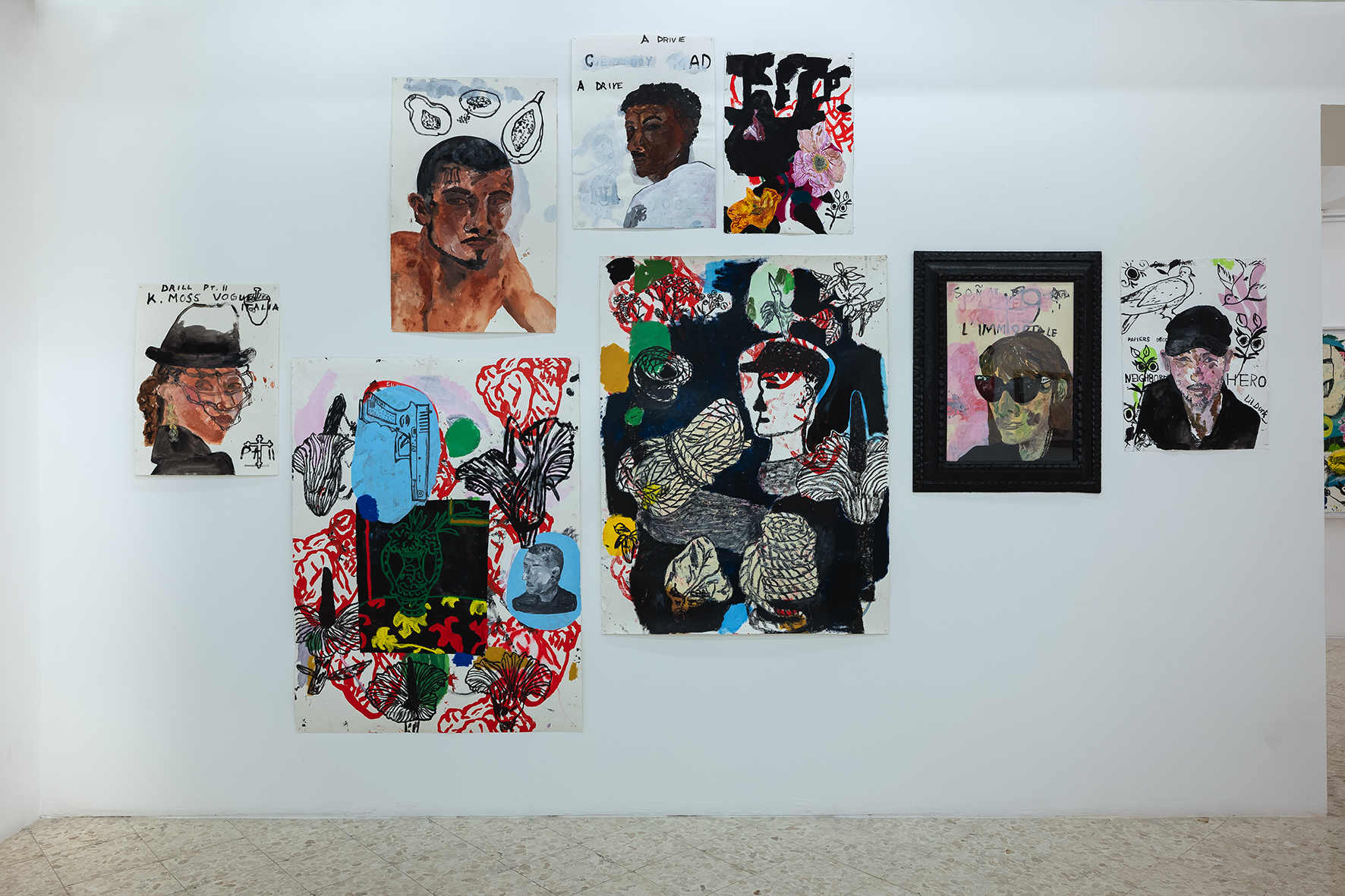 Le pareti della galleria appaiono come una costellazione di carte che vanno dal piccolo al grande formato, alcune meno recenti su fondo bianco, altre caratterizzate da colori più accesi e vivaci. Le opere su carta di Régis presenti in mostra hanno come filo conduttore il medium utilizzato: nonostante la ricorrenza dei soggetti– come volti, fiori, cibi, animali – ogni singola opera rappresenta un universo a sé. Ad alimentare il suo immaginario di riferimento contribuisce sicuramente il mercato di Ballarò, contesto dall’anima variopinta, popolare e multiculturale, nel quale si trova il suo studio palermitano. È proprio questa varietà ad attirare l’attenzione dell’artista: i vari soggetti scelti da Régis, infatti, portano con sé rumori, odori, sensazioni e la loro mera giustapposizione crea narrazioni ricche di contrasti e vitalità.