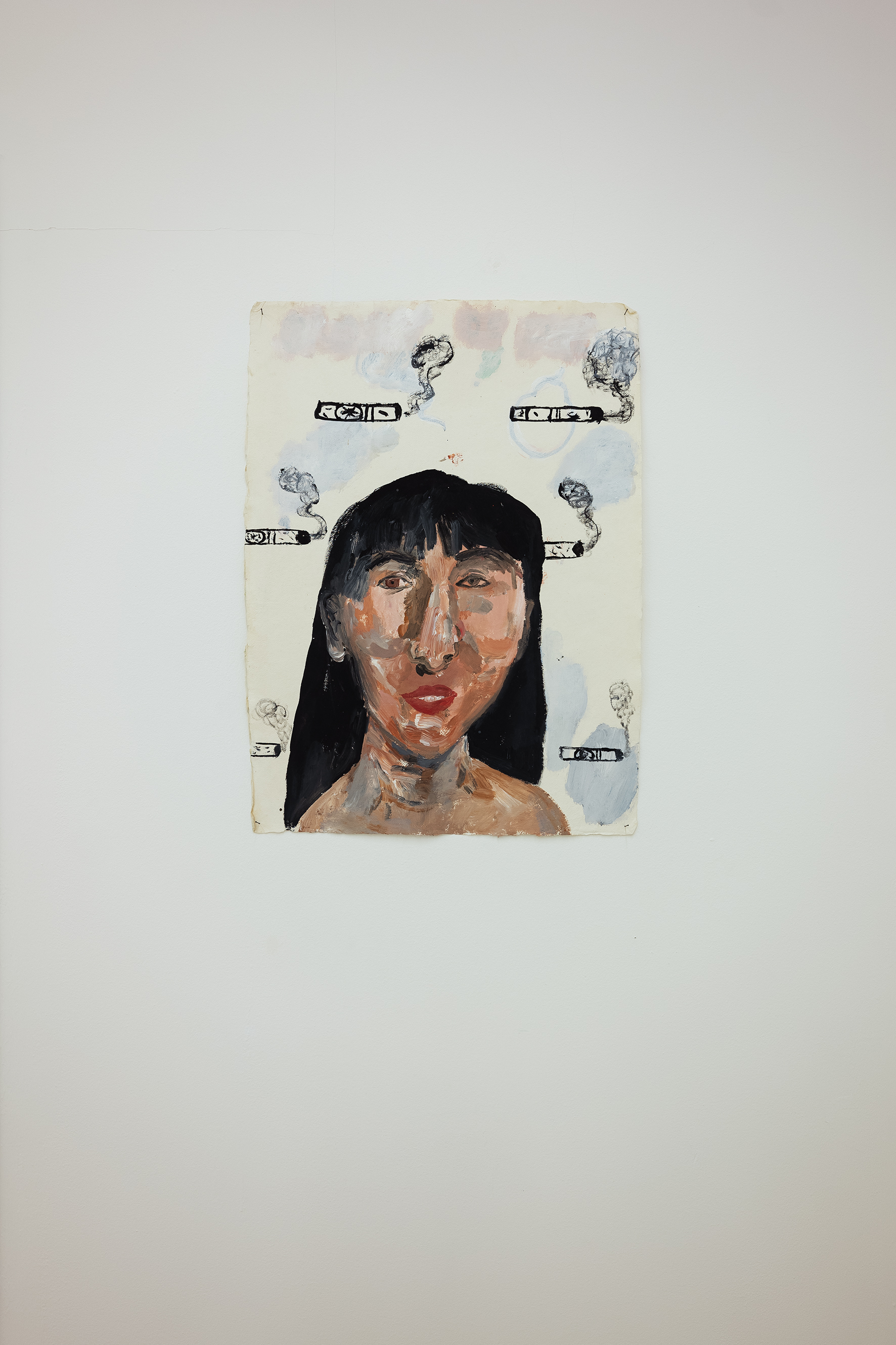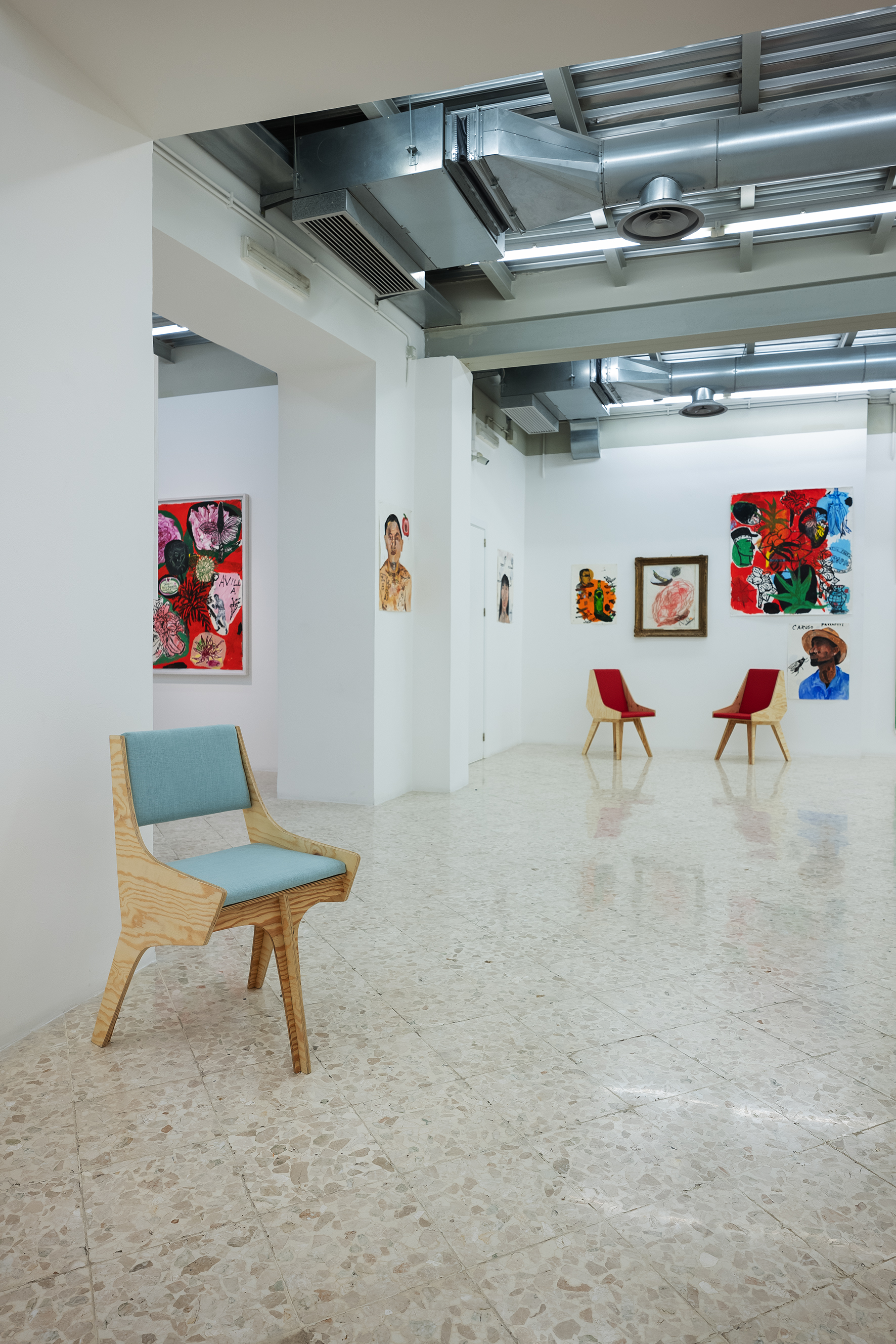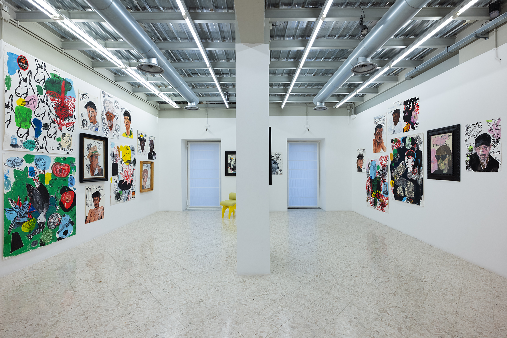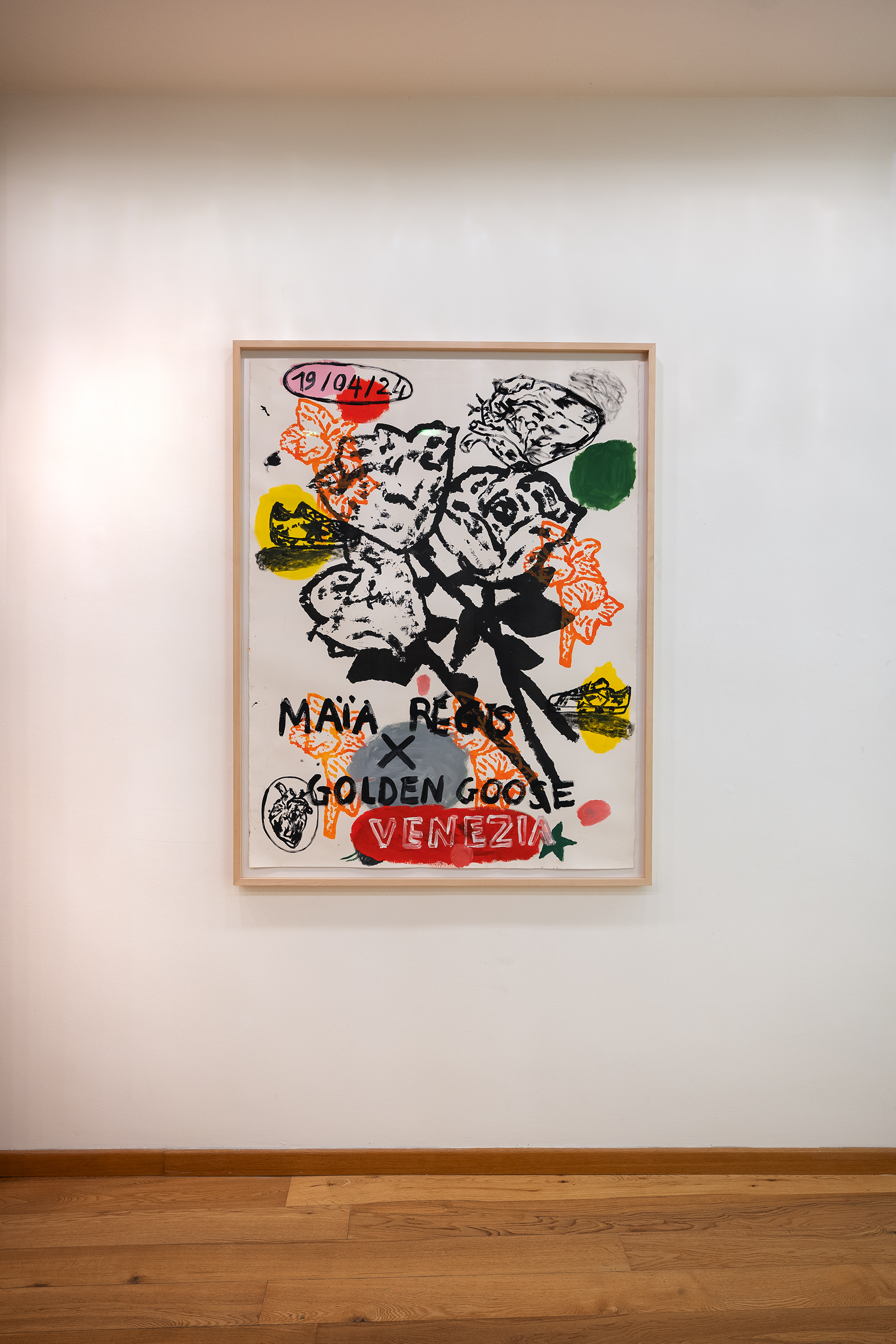 Le pareti della galleria appaiono come una costellazione di carte che vanno dal piccolo al grande formato, alcune meno recenti su fondo bianco, altre caratterizzate da colori più accesi e vivaci. Le opere su carta di Régis presenti in mostra hanno come filo conduttore il medium utilizzato: nonostante la ricorrenza dei soggetti– come volti, fiori, cibi, animali – ogni singola opera rappresenta un universo a sé. Ad alimentare il suo immaginario di riferimento contribuisce sicuramente il mercato di Ballarò, contesto dall’anima variopinta, popolare e multiculturale, nel quale si trova il suo studio palermitano. È proprio questa varietà ad attirare l’attenzione dell’artista: i vari soggetti scelti da Régis, infatti, portano con sé rumori, odori, sensazioni e la loro mera giustapposizione crea narrazioni ricche di contrasti e vitalità.