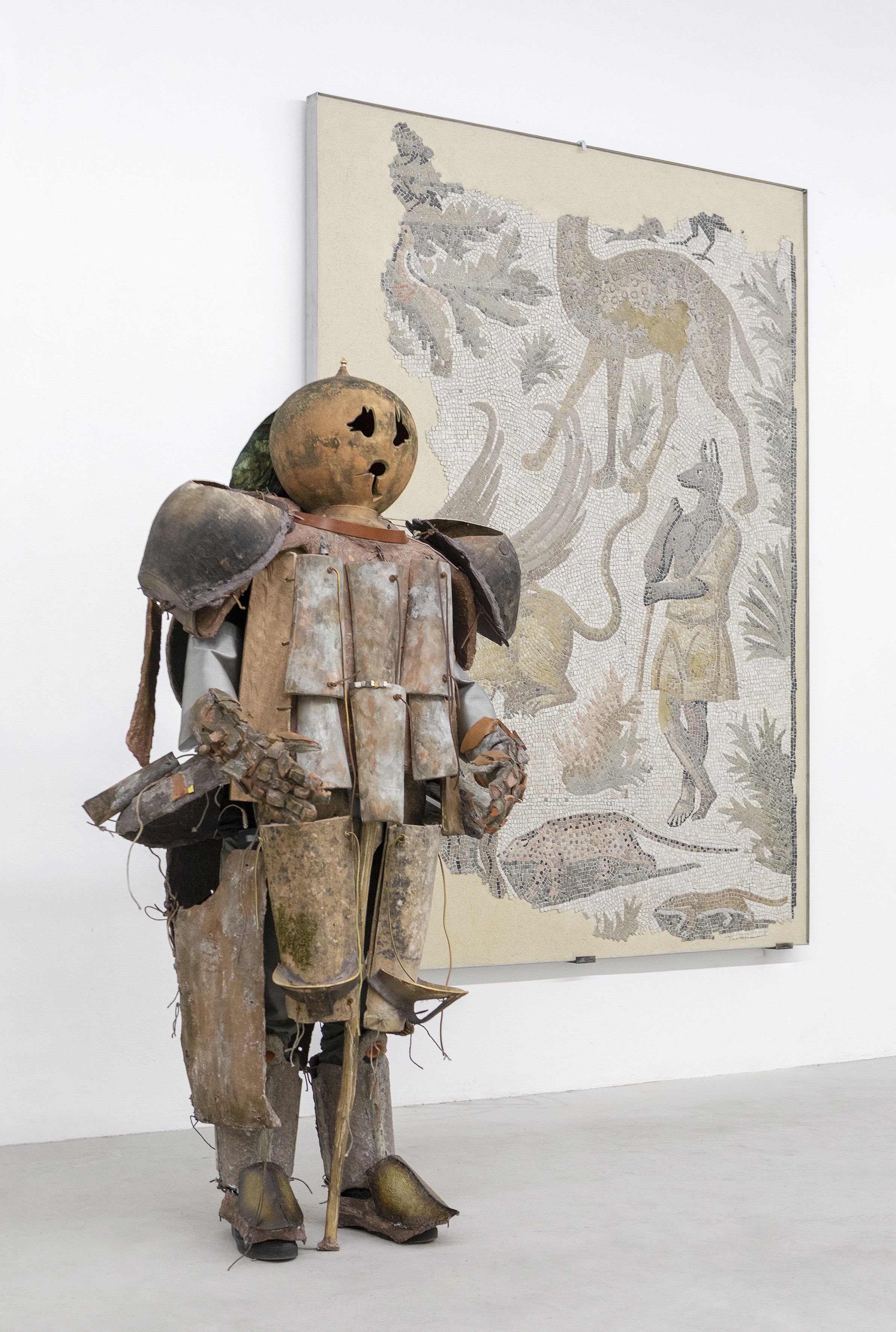 Al piano superiore, le sale del Museo d’Arte della città di Ravenna accolgono le opere frutto della loro collaborazione, avviata nel 2018 in occasione dell’edizione palermitana di Manifesta con il Ciclo del Solimandante esposto nella collettiva “Raymond” curata al Grand Hotel des Palmes di Palermo da Luca Trevisani. Questo dialogo tra i due artisti è continuato con un lavoro visibile sempre in mostra, la serie Anubis vs Baboon, presentata l’anno successivo nello spazio milanese Gluck50 e ispirata al cosiddetto Mosaico di Anubi (II-IV sec d.C.), conservato presso il Museo della Città di Rimini e per l’occasione esposto ora al MAR. Il rapporto con l’antico, possiamo sottolineare, è ampiamente indagato in questa mostra dove sono presenti una serie di opere e incunaboli ispirate alla leggenda del mostro di Ravenna e, più in generale, al concetto di mostruosità. Tra tutti, segnaliamo la presenza di un disegno di Leonardo Da Vinci proveniente dalla Biblioteca Ambrosiana di Milano e che, pur non essendo direttamente rappresentazione del Mostro di Ravenna, ne rivela le sembianze in maniera estremamente fedele, quasi compendio grafico della nota del diaro di Landucci.