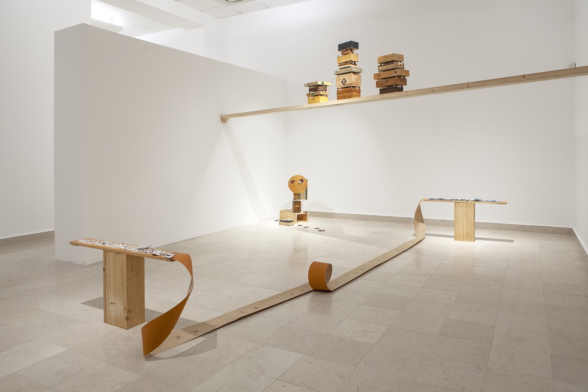 Cavaliere, a sua volta, presenta una ricerca più improntata all’intreccio linguistico, in cui scrittura, suono, voce, disegno e scultura si compenetrano sfociando in un’opera unica e dalla dimensione ambientale. Sempre più preponderante è anche l’aspetto performativo della sua pratica che è presente anche in questa mostra. Partiti da percorsi creativi diversi, di cui si fa ampia narrazione al primo piano del museo, i due hanno intessuto un proficuo dialogo che ha visto il loro lavoro incontrarsi su alcuni punti comuni quali il mosaico, il rapporto con la scultura, la deriva della loro ricerca verso esperimenti sonori.