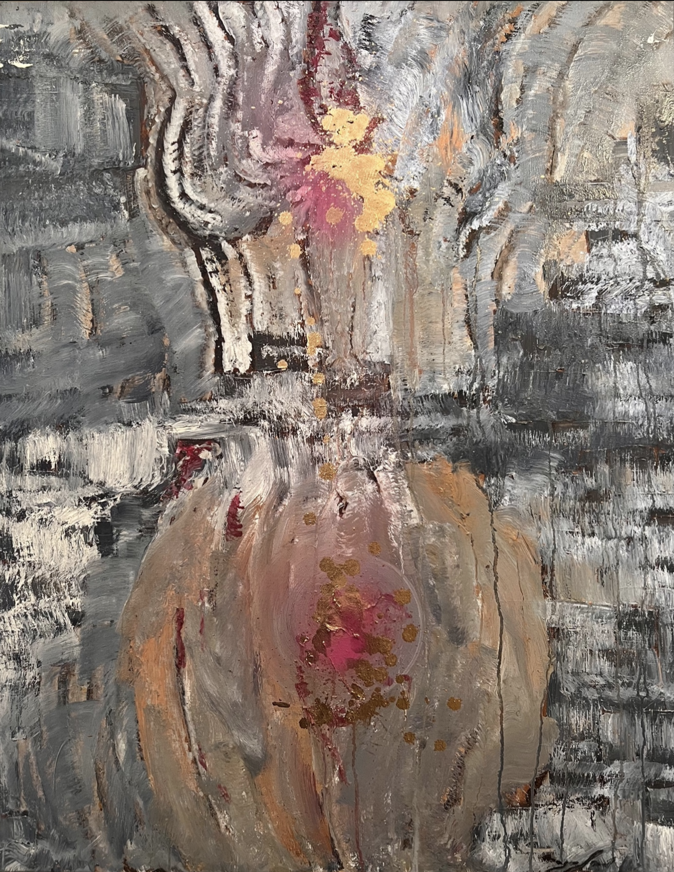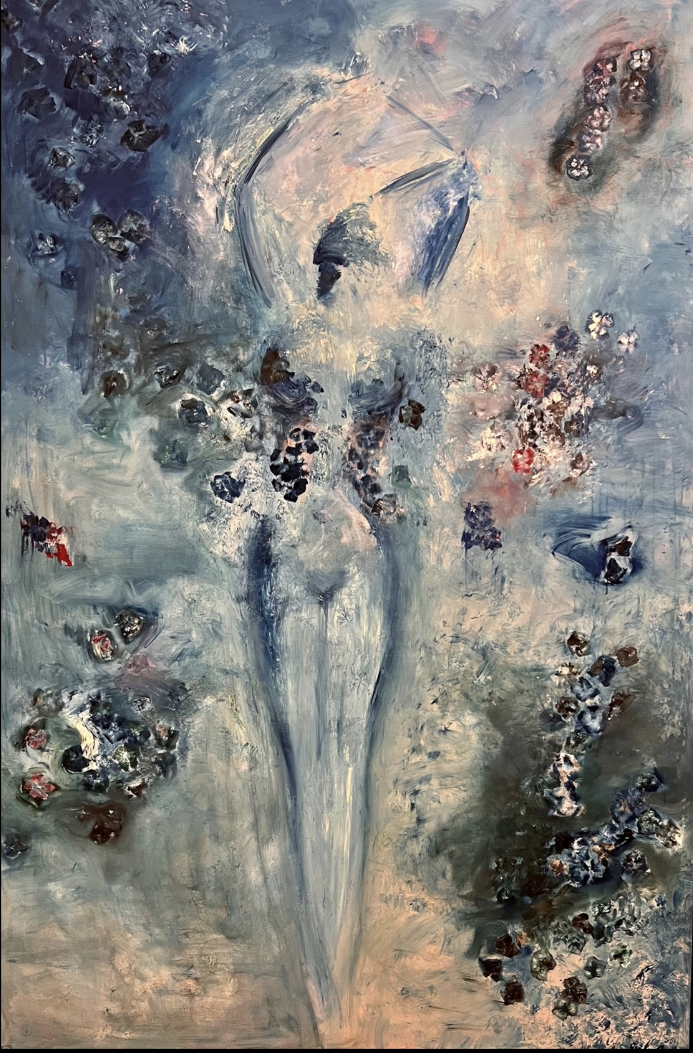 La stessa tecnica è presente anche in Solstizio d’estate, dipinto realizzato attraverso 21 giorni di profonda meditazione in cui l’artista si è ispirata a Kali, la dea indù del tempo, del cambiamento e della distruzione. Simbolo degli aspetti sia creativi che distruttivi dell’energia femminile divina, è spesso raffigurata con un comportamento feroce, che incarna sia gli aspetti terrificanti dell’esistenza sia il potenziale per una profonda trasformazione spirituale e liberazione. Nonostante il suo aspetto spaventoso, Kali è anche una dea madre compassionevole che protegge ferocemente i suoi devoti e distrugge le forze del male per mantenere l’equilibrio cosmico.