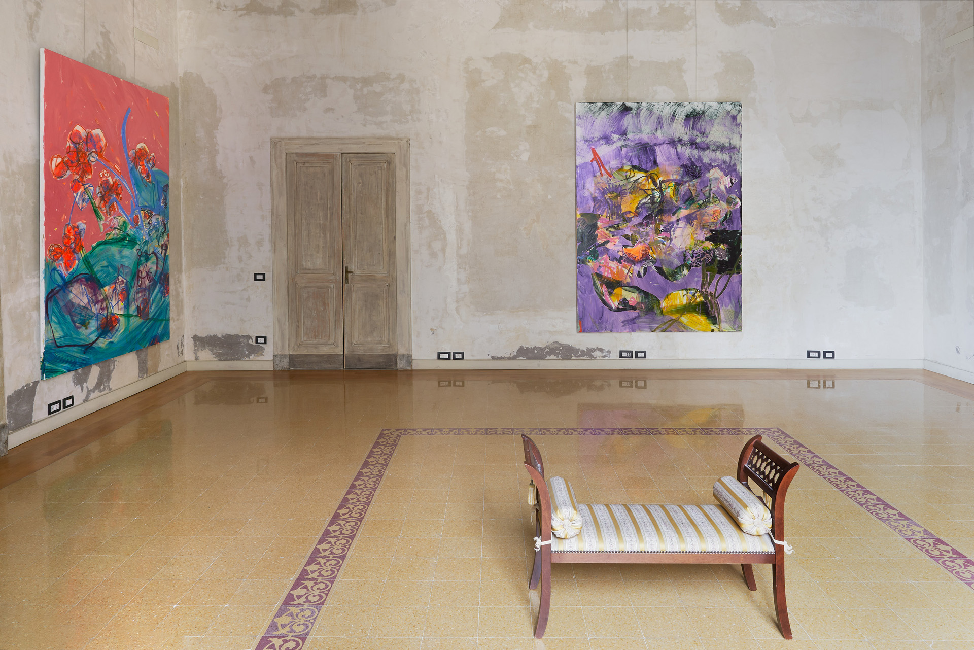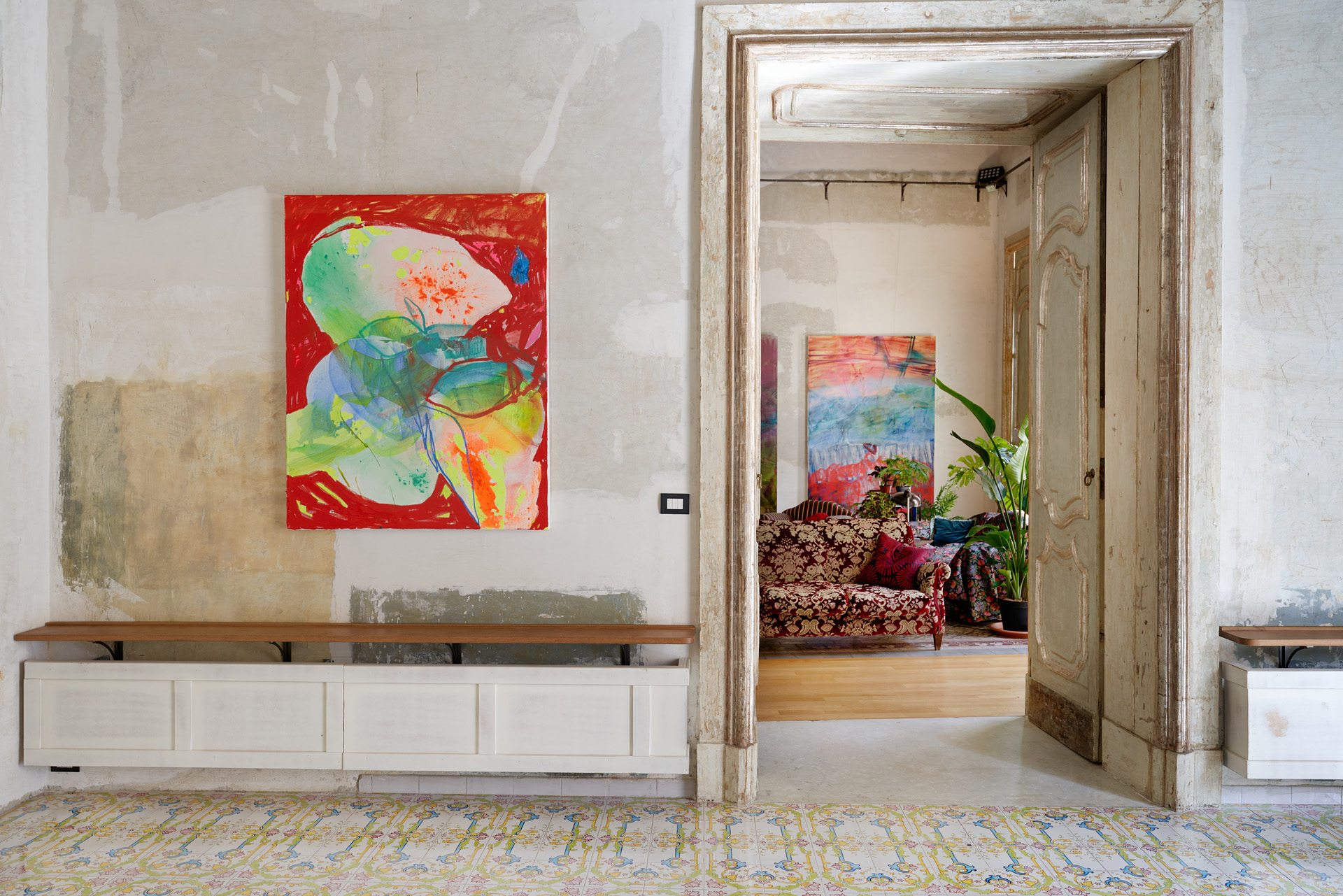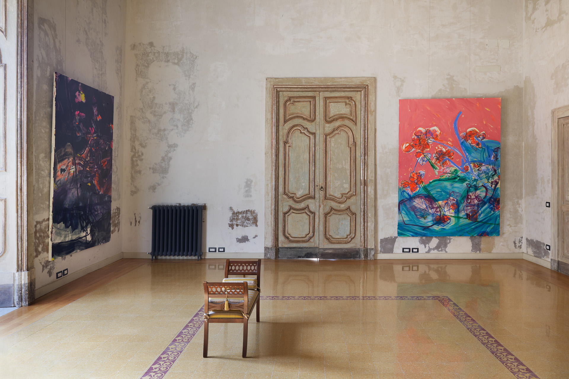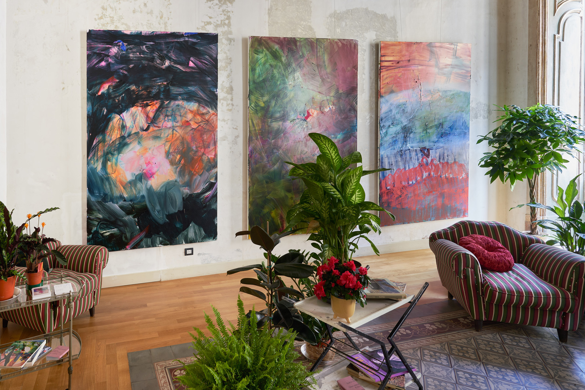 Se non fosse per quelle linee, quel ritmo, quei colori, potremmo pensare a Jadé Fadojutimi, come a una giovane artista che disegna fiori. Ma c’è dell’altro. Senza nemmeno accorgercene eccoci nel suo atelier, riprodotto per la sua prima mostra in Italia, dopo aver salito le scale di Palazzo Degas a Napoli. È in certi momenti che assapori la magia dei palazzi di Napoli, una vita a leggere i numeri civici, questa volta il 53, ed ecco che ti ritrovi a osservare dall’alto quegli stessi passanti che con te hanno attraversato Piazza del Gesù, per poi proseguire verso Calata Trinità Maggiore, in uno spazio che ora ospita una mostra temporanea e, tra qualche mese, chissà cosa. Why wilt when, When wilt why? A smile can appear in an echo of laugher, è il titolo della mostra personale dell’artista britannica Jadé Fadojutimi, un giovane astro dell’arte contemporanea, scelta dalla Galerie Gisela Capitain per la quarta edizione di Zweigstelle Capitain, un concept di mostre itineranti lanciato nel 2022.