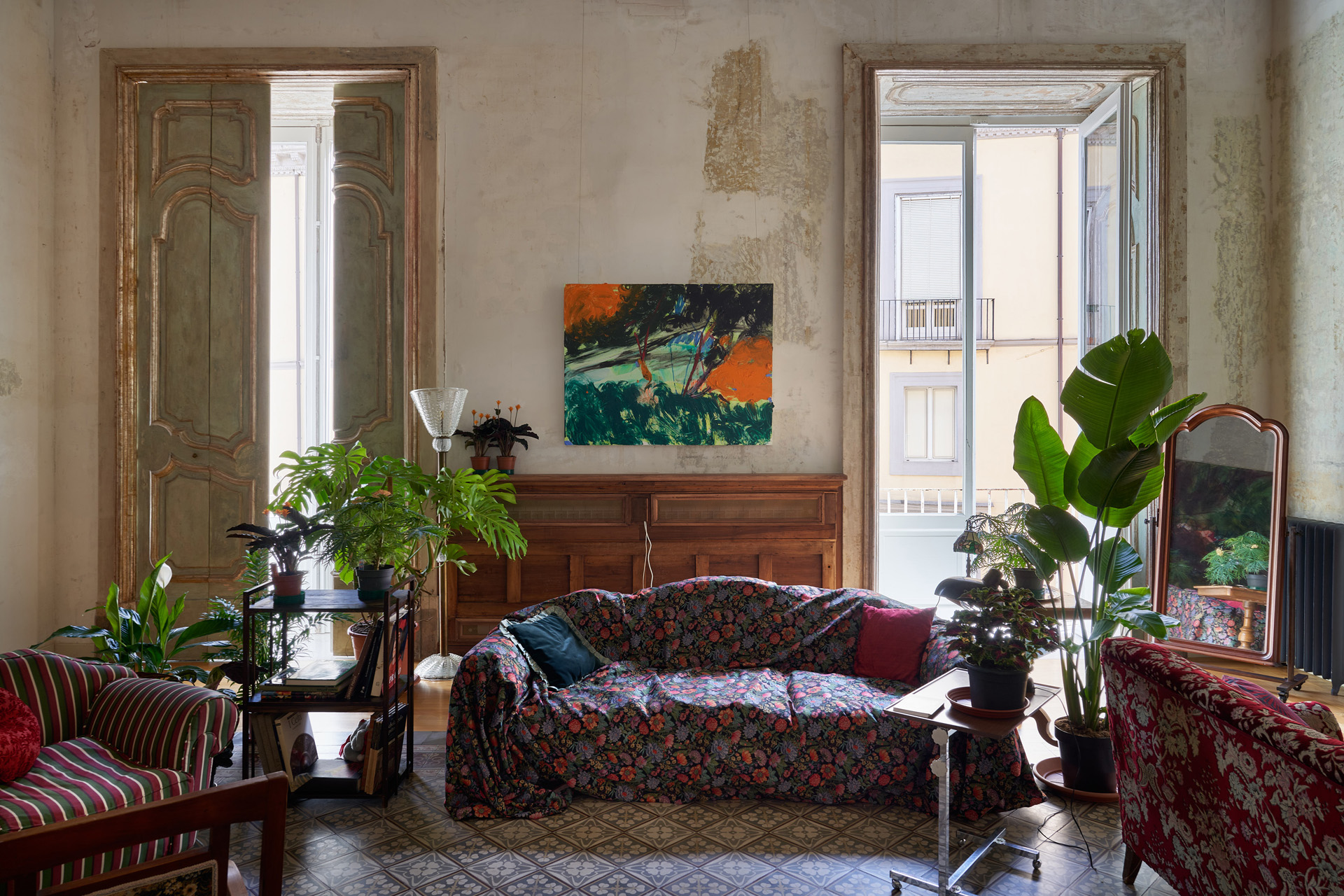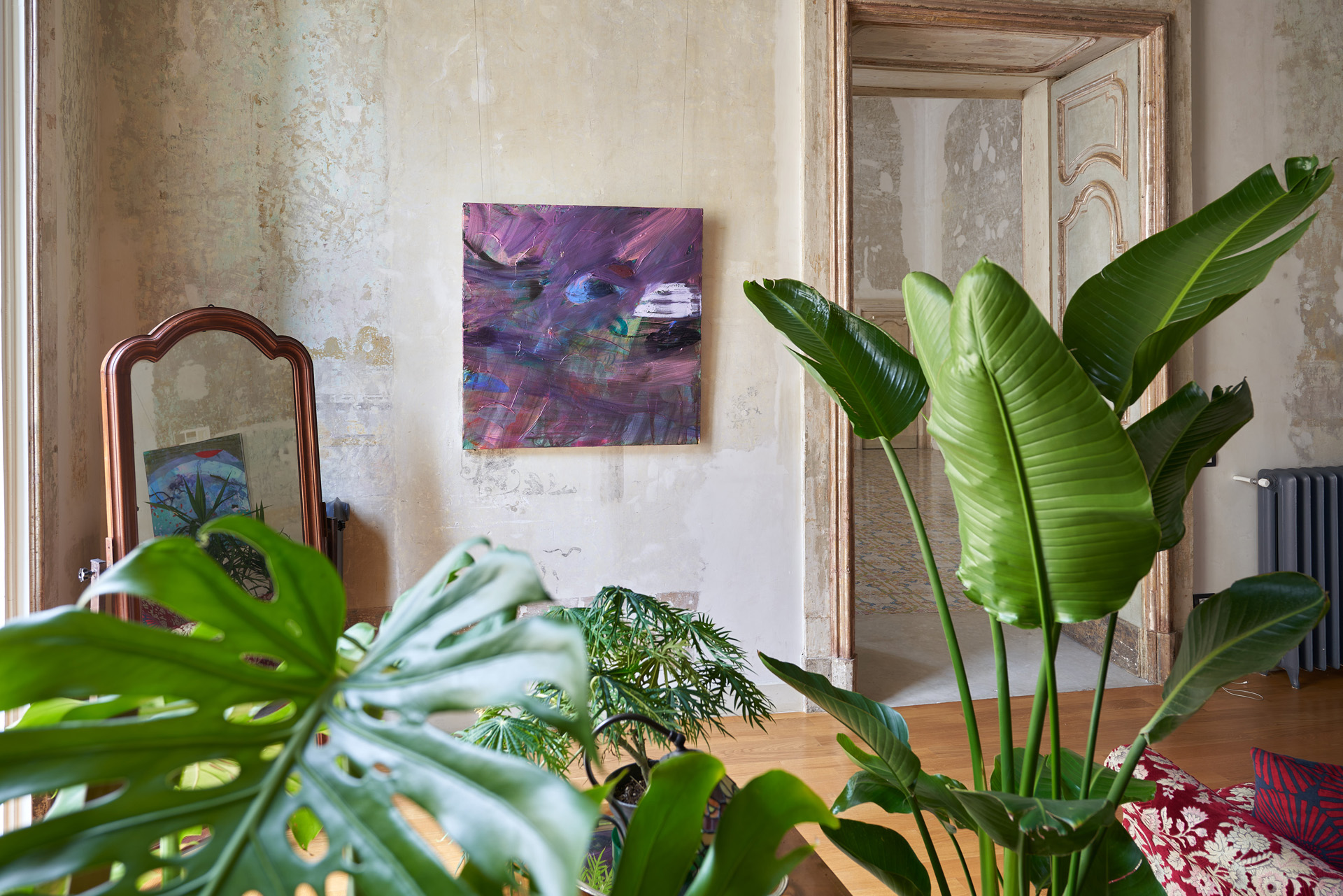 Basta vedere il suo Instagram per riconoscerne lo stile anche sui suoi abiti e così ce la immaginiamo in quella che è la “ricostruzione tipo” del suo studio, tra divani rococò e peluche dell’infanzia, una bottiglia di sakè sul tavolino, circondati da verdi piante esotiche in vaso. Appoggiati alle pareti, gli enormi dipinti, un’eco di risate, come suggerisce la poesia.