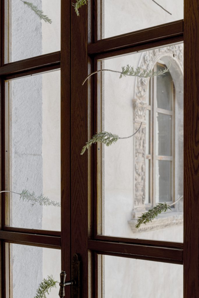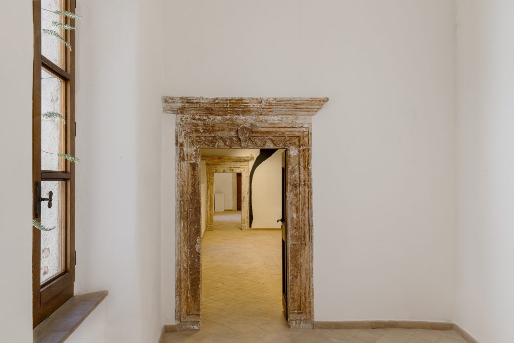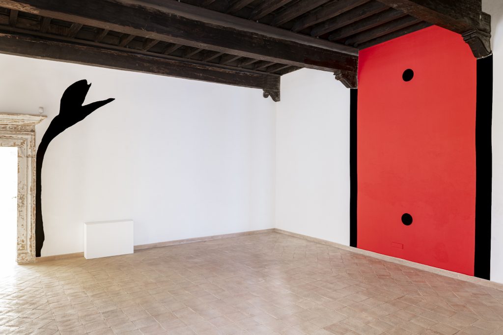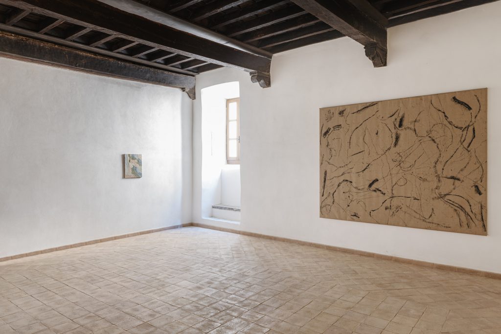 Di fronte a quest’opera, all’apparenza non figurativa in realtà espressione pittorica fortemente gestuale, una composizione pittorica e scultorea matura di Marco Emmanuele introduce gli altri suoi interventi, disseminati nello spazio, accomunati dalla presenza costante del vetro quale principale mezzo espressivo. Alla testa dell’acqua è una scultura in bronzo e vetrofusione velatamente ispirata dalle rappresentazioni medievali della fanciullezza, in dialogo con l’opera di Alessandro Giannì sviluppata da una rlessione sullo statuto contemporaneo delle immagini, pittoriche e non solo, attraverso il dialogo con un’intelligenza artificiale, ironicamente soprannominata Vasari. Uno spazio compreso tra lo zero e l’uomo è invece un gentile intervento site-specific con cui, con fare minimale, Emmanuele applica piccoli fori in una delle finestre del palazzo in cui dispone rametti di rosmarino creando un varco, simbolico ma tangibile, tra lo spazio interno e quello esterno.