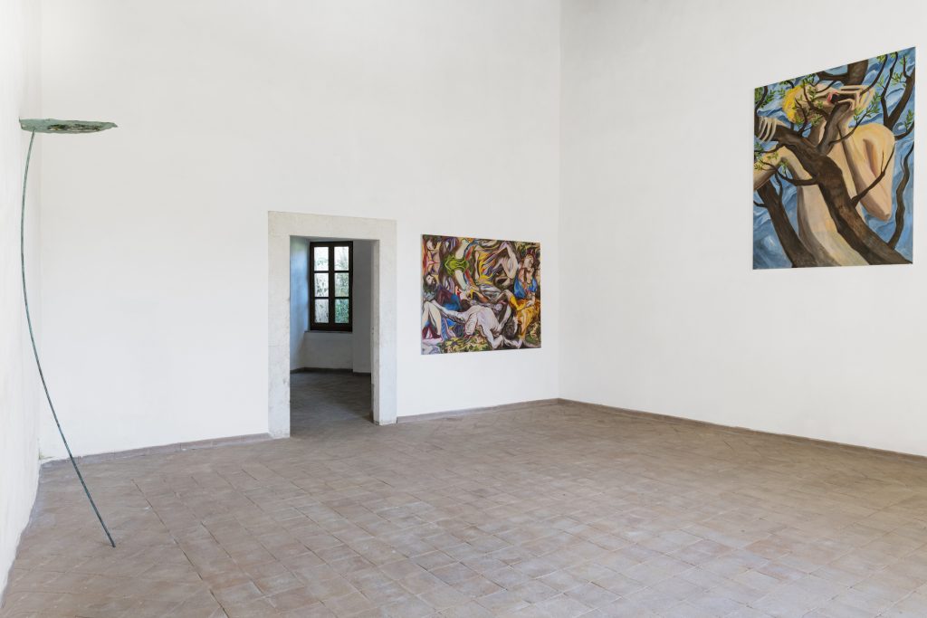 Intorno alle ricerche di Fumarola, che in passato ha molto lavorato sulla percezione dell’uomo dallo stato di sonno / sogno a quello di veglia (Immagini del risveglio) e di Giorgi Alberti che «rompe il giocattolo del mondo per vedere meglio come funziona», le figure maschili imponenti, fragile e solitarie di Dario Carratta tentano, in maniera quasi bestiale, di fondersi con il paesaggio naturale, specchio e riflesso del loro mondo interiore. Come l’uomo della sabbia di E.T.A. Hoffmann, così le opere sono un chiaro simbolo, pittorico, di quella dimensione familiare e perturbante in cui realtà, sogno e allucinazione attingono informazioni e suggestioni. Metafore e a volte arcani, queste figure dialogano con un’esile scultura in ferro battuto di Andrea Polichetti, che in mostra presenta anche i protagonisti astratti e inconsapevoli (il fil di ferro, la carta vetrata, un rotolo di pluriball e i detriti dello studio) di un racconto intimo e autobiografico, quello di un’adolescenza dedicata al mestiere dell’arte, su una grande tela di iuta (Senza titolo, 2023).