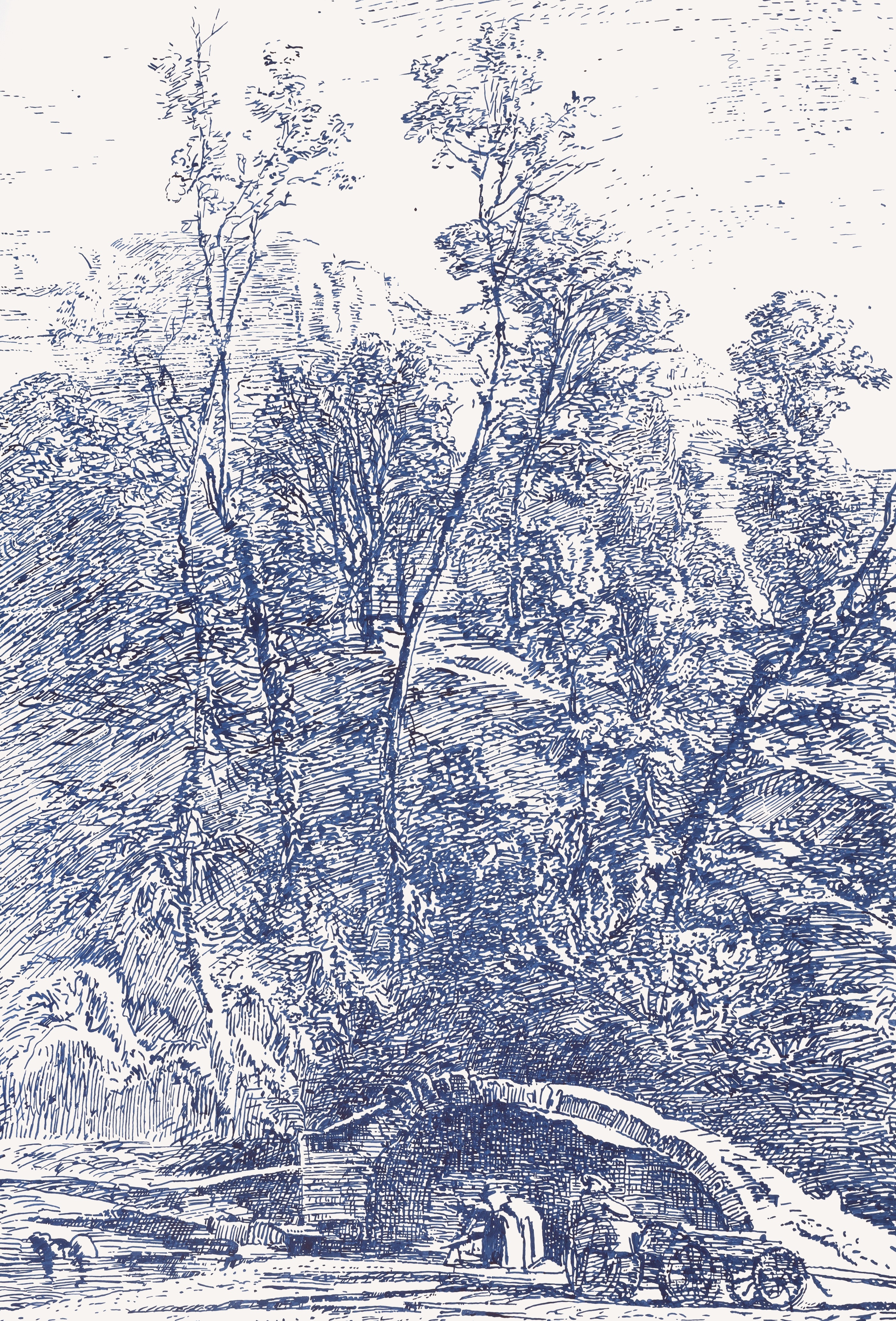 Anno focale del suo percorso artistico il 2012 quando l’artista “incontra” una piccola incisione di Barthelémy Menn (1815-1893), artista ginevrino di grande importanza per la pittura svizzera di paesaggio del secondo Ottocento e per Gabutti stesso perché inizia a trasporre tale opera dai suoi 180×115 mm ai 2200×1500 mm di fogli grandi con un forte salto di scala. In tale modo Gabutti crea disegni monumentali a inchiostro con notevole impiego di tempo e con risultati eccellenti anche di chiaroscuro, rendendo contemporaneo il paesaggio. Un incanto fatto di boschi, intrichi di rami, cascate, giardini e sentieri (interpretato spesso come sentiero che conduce verso l’ignoto, tema simbolista) senza dimenticare il paesaggio alpino irrinunciabile per chi vive in Svizzera. Le rovine dei romantici diventano per lui un ponte di ferro e un contorto gazebo le cui forme si integrano con quelle fluide create dalla natura, il tutto realizzato con inchiostro o grafite e recentemente anche con matite colorate.