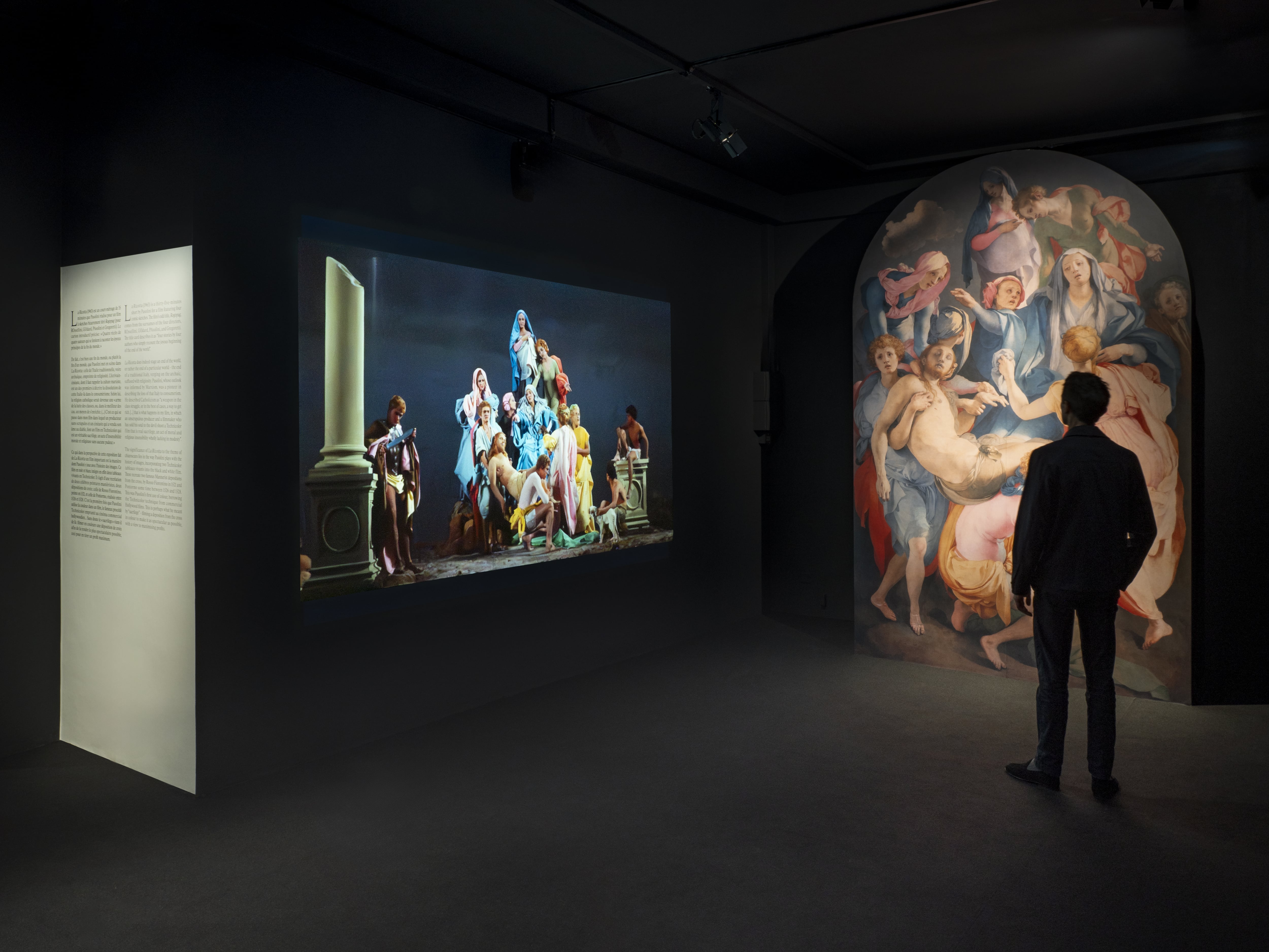 Il confronto tra la grande tradizione pittorica e i film pasoliniani continua in La Ricotta (1963), un mediometraggio sulla morte di Cristo, dove Pasolini si ispira, per due sequenze, alla Deposizione dalla croce (1521, olio su tavola) di Rosso Fiorentino e alla Deposizione (Trasporto di Cristo) (1526, 1528, tempera a uovo su tavola) di Jacopo da Pontormo. Nel mettere in risalto le opere di questi due grandi manieristi fiorentini, il regista sceglie il colore, in una pellicola realizzata in bianco e nero. Francis Bacon, il pittore espressionista, e Pasolini sono uniti da temi come l’alienazione, la solitudine e l’angoscia esistenziale. L’urlo alienato di Head VI (1949) di Bacon dialoga con quello di una disperata speranza del personaggio del padre, Carlo, nel film Teorema (1968), offrendoci un’esperienza cinematografica intensa e metafisica. Le relazioni tra cinema e arte figurativa sono ben più profonde e radicate nella persona curiosa e travolgente che era Pasolini.