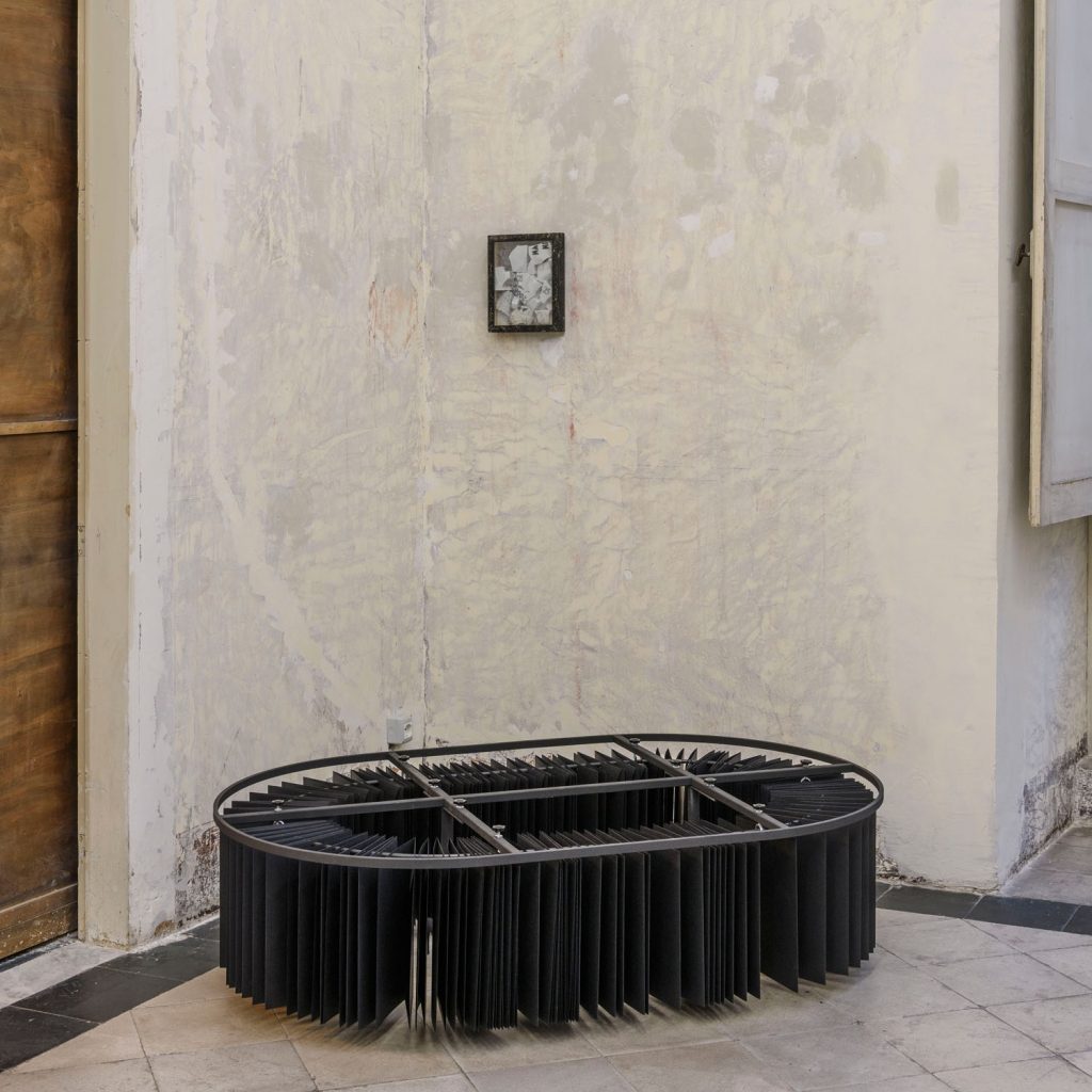 Allora, rispettando le proprietà di ciascun alfabeto, la bipersonale trova un primo terreno comune di tipo tecnico, corrispondente – come enunciato nel testo – a «un’attitudine rigorosa nei confronti della ricerca sui materiali e la loro trasformazione, prelevandoli dalla realtà per poi ripensarli attraverso una studiata progettualità». Tale predisposizione, per ambedue, si esplicita nella tendenza a lavorare con l’oggetto di ambito quotidiano, liberato dai vincoli della funzione e risolto, da ognuno, assecondando i toni del proprio regime stilistico. Ciò nonostante, nelle due pratiche sussiste unanimemente la capacità di veicolare un senso d’assenza. Quest’ultima prerogativa, in Lo Cascio, è dovuta non solo alla tipologia degli espedienti impiegati – cartelle vuote, tamburi di serrature – ma anche agli intervalli vuoti concretamente presenti nella costituzione delle sue sculture e delle sue installazioni.