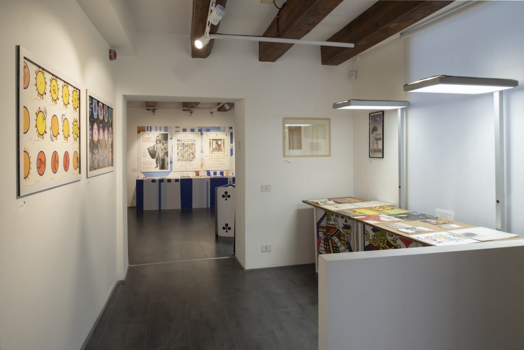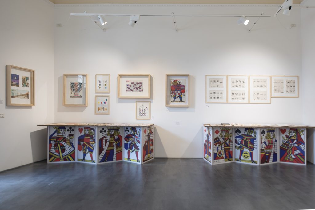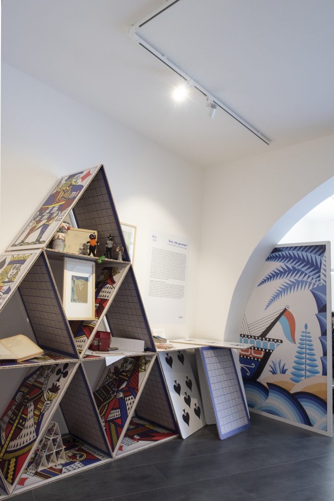 In apertura un castello di carte conserva alcuni preziosi documenti preziosi della biografia di Paola Pallottino, che tra il 1966 e il 1976 iniziò a lavorare scrivendo e illustrando testi per l’infanzia e scientifici per le case editrici Ponte Nuovo, Emme Edizioni, Zanichelli, Marsilio e Sansoni. Della collaborazione con Emme Edizioni sono esposti i volumi Week-End del 1974 e La Barca del 1976, insieme a un raro calendario del 1974 (una serie di animali che si costruiscono di volta in volta nel cambio del mese), e a Bimbo gioca del 1975 (una scatola con un mazzo di carte giganti per costruire castelli).