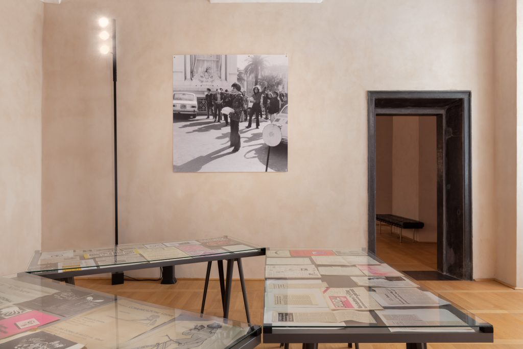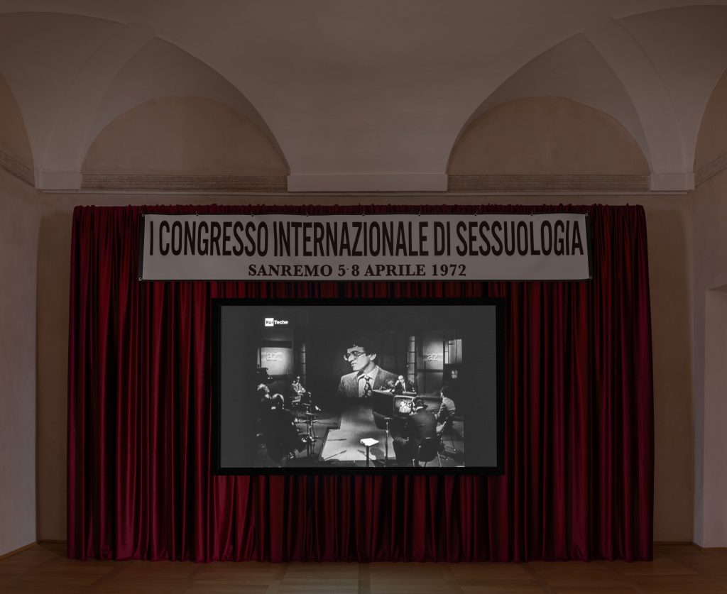 Storiograficamente, la mostra individua quel contesto attraverso materiali d’archivio. Tra questi è interessante dedicarsi ai circa 10 minuti di contributo video, proveniente dalle teche Rai (ma pensa un po’), realizzato pochi mesi dopo gli accadimenti di Sanremo. La scelta di simulare il palco del congresso per la sua proiezione risponde a una scelta evidente in questa mostra: abbinare parallelamente il piano storico a quello puramente emotivo. È come se si volesse “pennellare” quell’atmosfera, riproducendo un’aura tempo-spaziale; anche con l’ausilio delle gigantografie bianco e nero di Mario Mieli, all’esterno del Casinò di Sanremo. O della scrittrice Françoise d’Eaubonne affacciata sul palco del congresso, che a guardarla col naso in su è come se cercasse ancora il suo pubblico. Intanto, sotto il palco, lunghe tavolate ordinatamente rispolverano articoli, incrociando in modo diacronico quel momento specifico agli anni a venire.